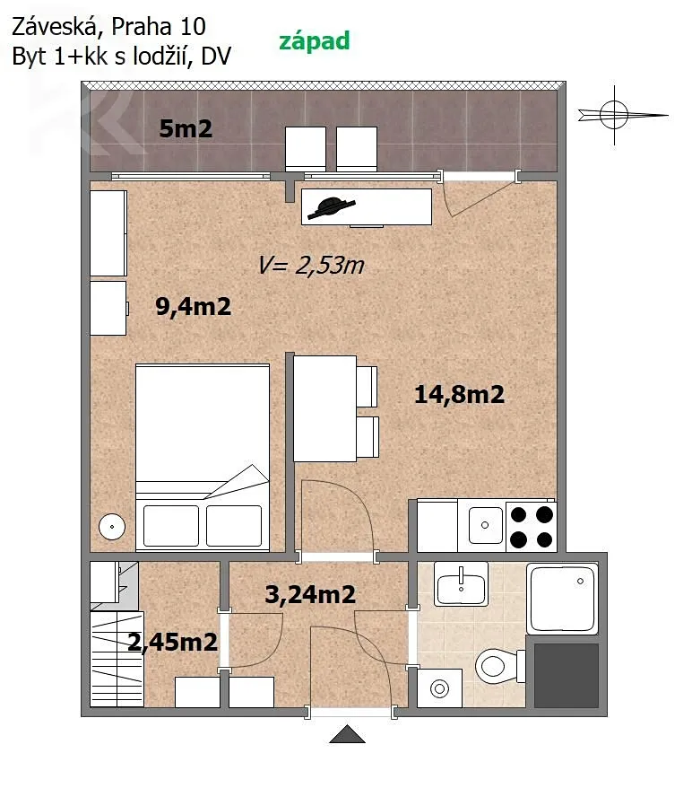 Pronájem bytu 1+kk, Praha - Hostivař, Záveská, 44 m2