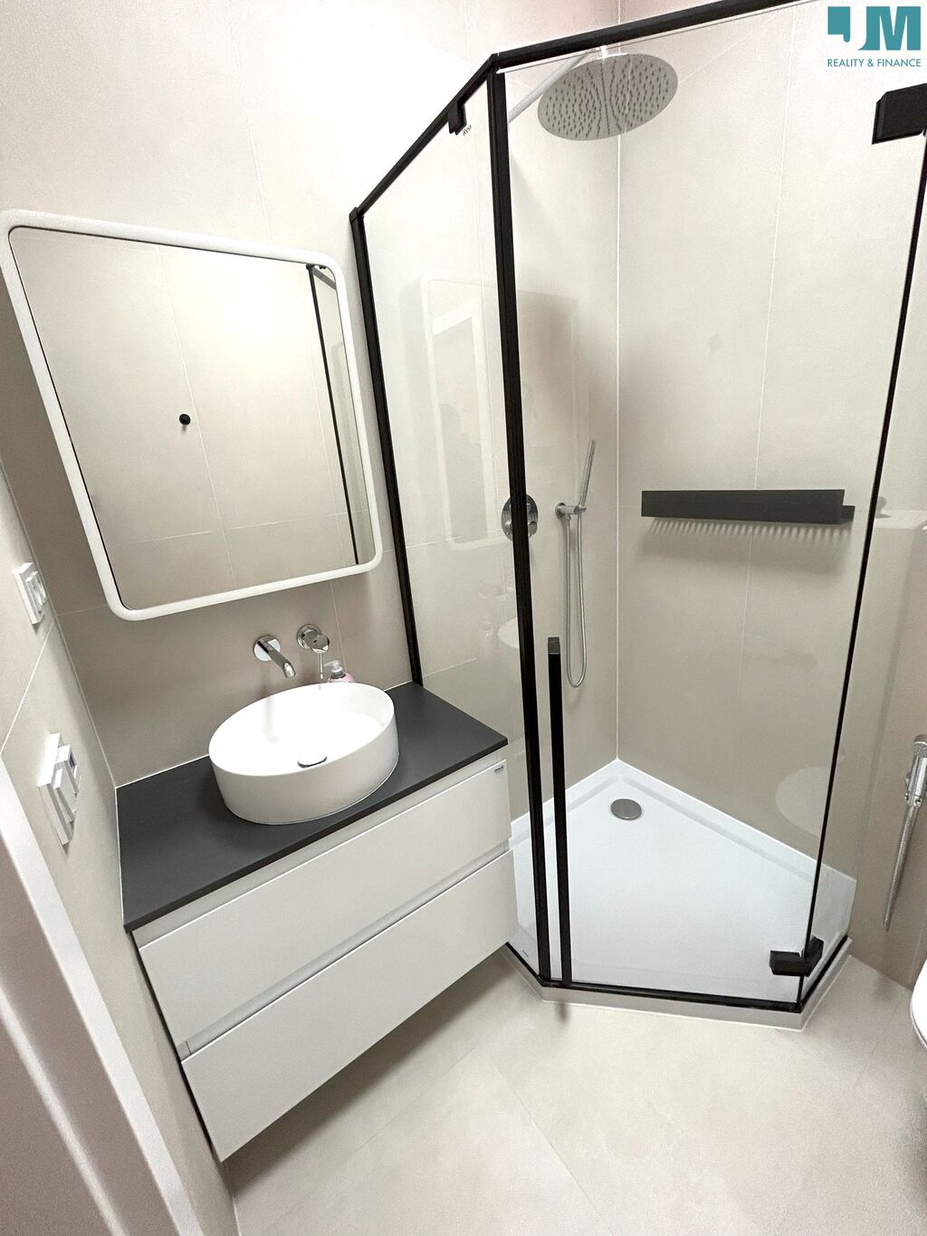 moderní koupelna navržená designérem – originální sprchový kout, nadčasové barevné provedení a možnost měnit barvu stropního LED osvětlení,
