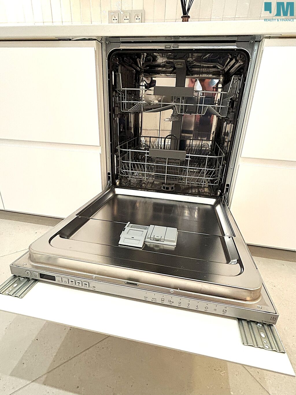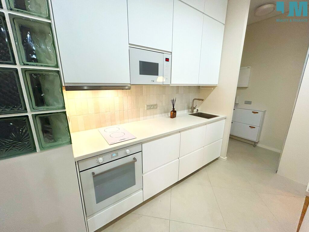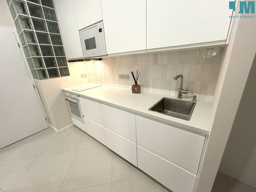 plně vybavená kuchyňská linka: lednice, mikrovlnná trouba, indukční deska, pračka (bude součástí pronájmu), pečicí trouba a myčka,