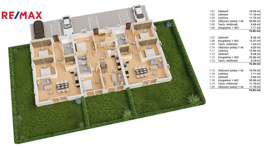 1. REZERVACE (levý, krajní) 3+kk 76 m2 se zahradou 71 m2 + parkovací plocha před bytem 31 m2 (cena 4.890.000,-) REZERVACE
