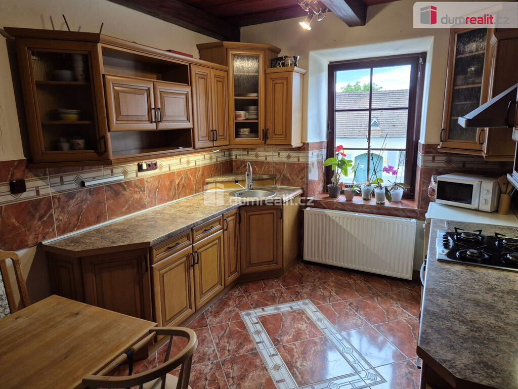 Částečně podsklepený dvoupodlažní dům nabízí v prvním patře prostorný, designově osobitý byt 4+1, kdy tři ze čtyř pokojů jsou neprůchozí a ložnice je napojena otevřeným průchodem na obývák s dekorací z kamene. V koupelně je vana, umyvadlo WC a prostor na pračku. Z centrální chodby je průchod prosklenou stěnou na verandu, ze které je skvělý přehled o dění na zahradě. Dále v podkroví započatou vestavbu, potom zahradu, stodolu a garáž.