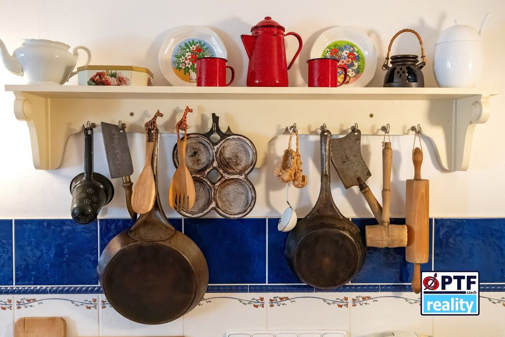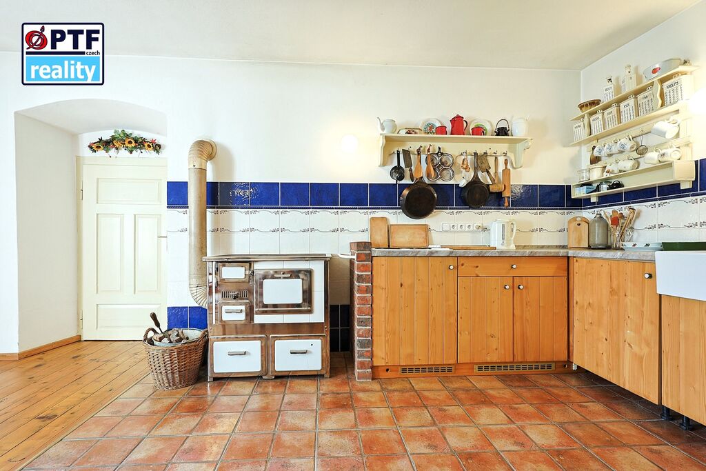 centrální obytná kuchyně s kachlovými kamny a elektrickou varnou deskou