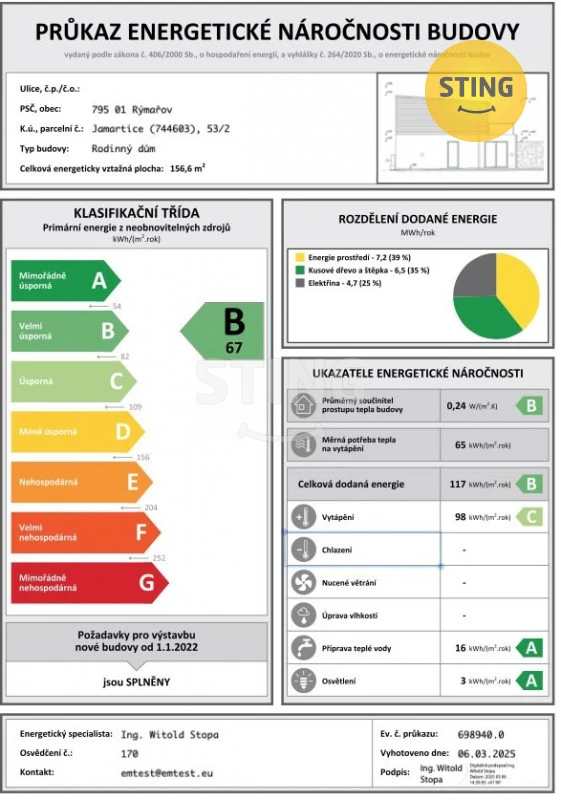 Jedná se o energeticky nenáročný dům kategorie B - velmi úsporná.