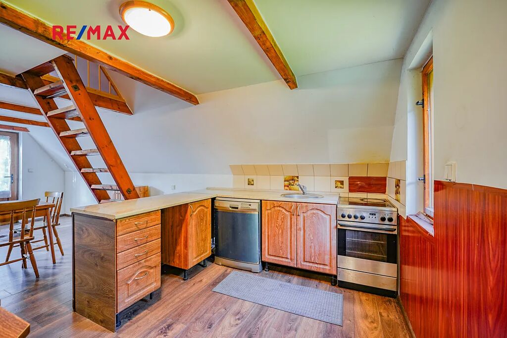 Dům je rozdělen do tří podlaží, v 1. podlaží se nachází vstupní chodba a místnost kterou lze využít například jako dětský pokoj. Ve 2. podlaží se nachází obývací pokoj s krbem, kuchyní a koupelnou se sociálním zázemím. Ve 3. podlaží nalezneme další pokoj který lze využít například jako dětský pokoj, ložnici a nebo pracovnu. Dále je na zahradě k dispozici polozapuštěný bazén a domek pro zahradní náčiní. Díky vysokým vzrostlým stromům po obvodu pozemku nabízí zahrada dostatek klidu a soukromí. Dům prošel 10 let zpět kompletní rekonstrukcí včetně zateplení, je vybaven plastovými okny s dvojskly, elektroinstalací kompletně v mědi, plovoucími podlahy a střechou z plechové taškové krytiny. Vytápění je zde řešeno pomocí krbu a ohřev vody pomocí elektro bojleru.