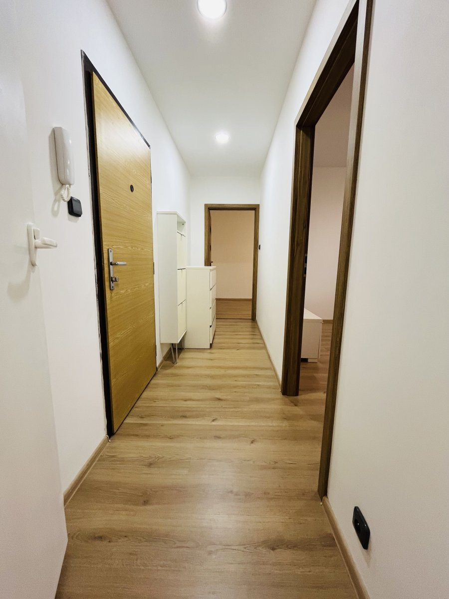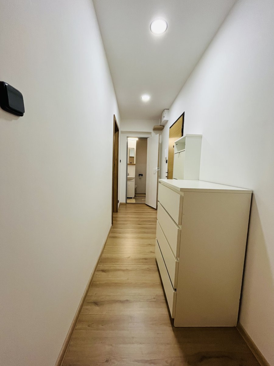 Nabízí jeden neprůchozí pokoj, do kterého vstupujeme z dlouhé chodby, která disponuje botníkem a komodou. Z chodby také míříme do průchozího pokoje a do koupelny se záchodem. Ta je společná.