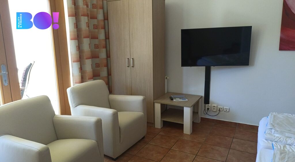 Apartmán o výměře 49,88 m² je kompletně zařízen novým nábytkem a nachází se v přízemí budovy.