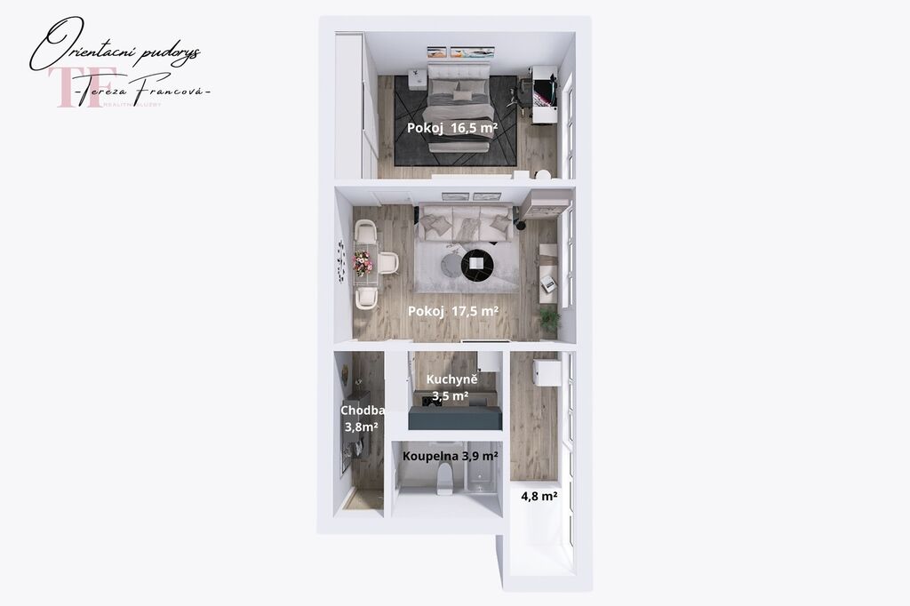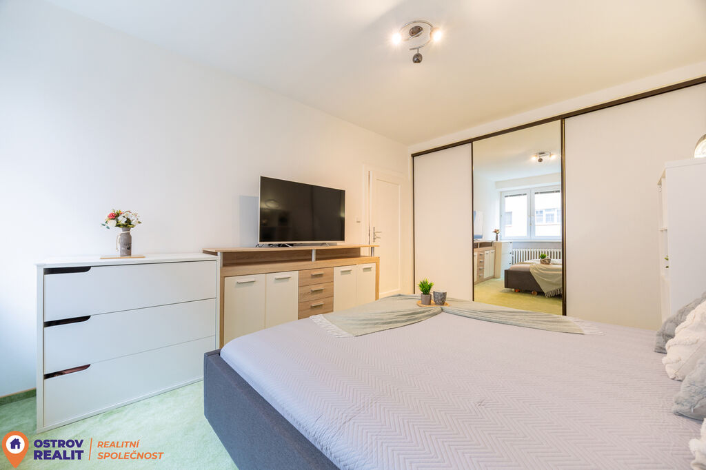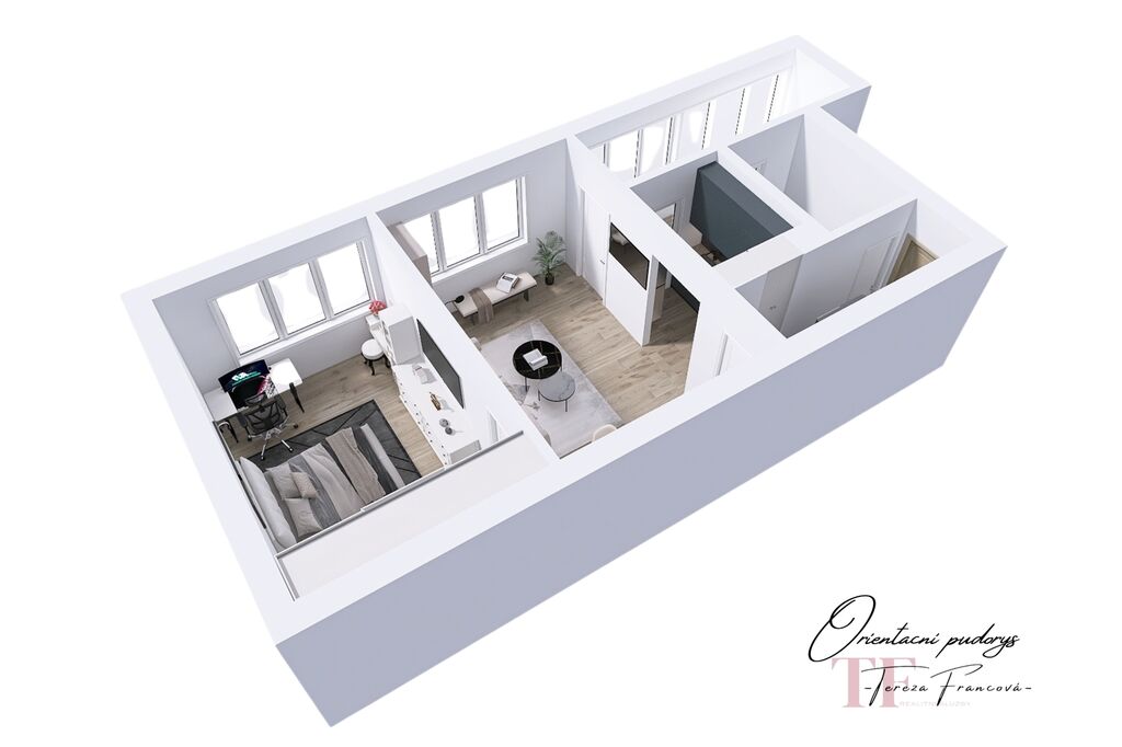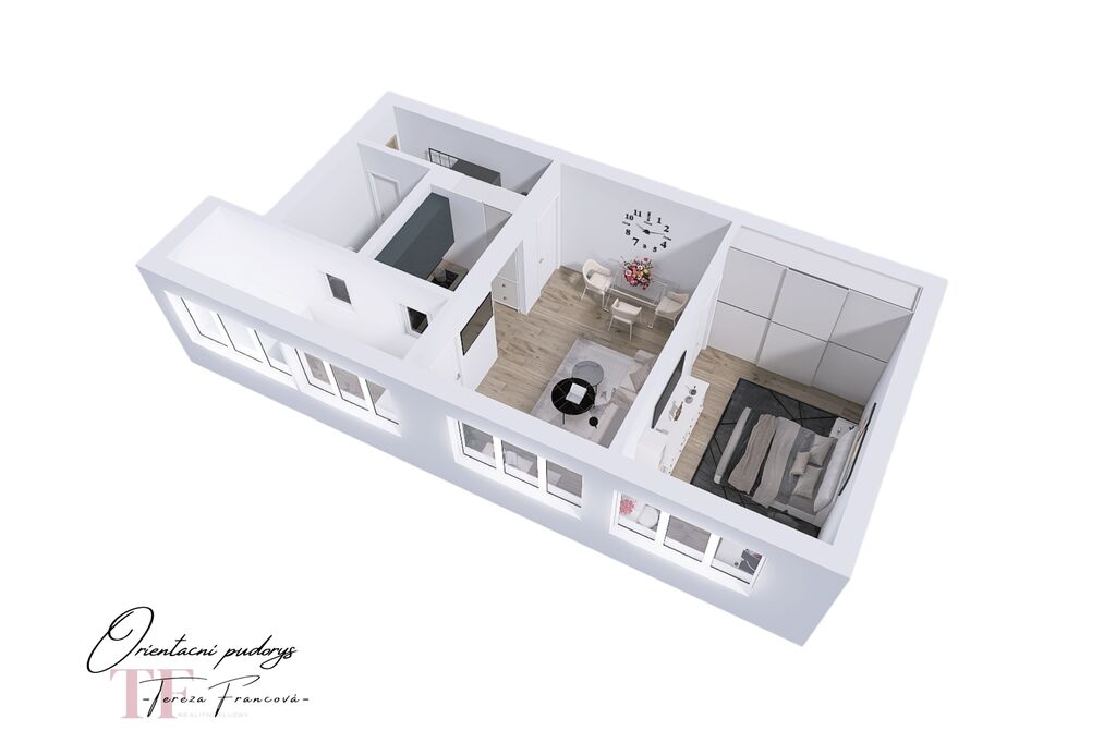Dominantou bytu je prostorný obývací pokoj s kuchyňským koutem, kde je možné umístit jídelní stůl, rohovou sedačku i obývací stěnu. Na něj navazuje samostatná ložnice, která poskytuje klidné zázemí pro odpočinek. Velkou výhodou je zazděná lodžie, která je díky velkým oknům světlá a funkčně využitelná jako pracovna, malá dětská herna nebo malý pokoj pro hosty. Koupelna je vybavena vanou a toaletou, přičemž je zde prostor i pro pračku. Dispozici doplňuje vstupní chodba s možností umístění vestavěných skříní.