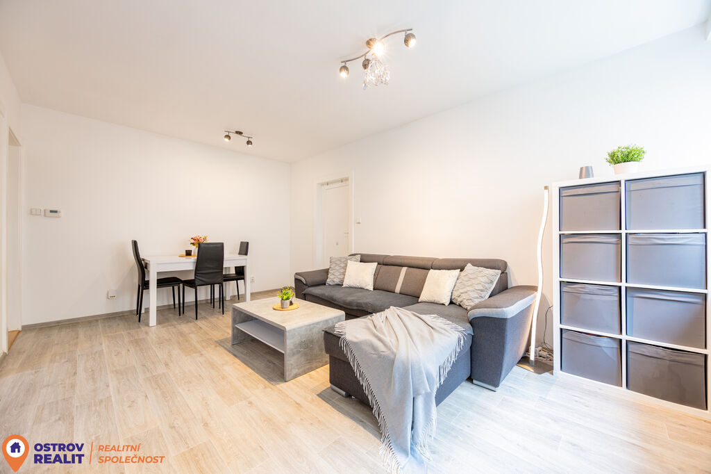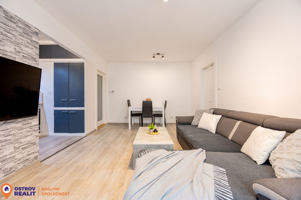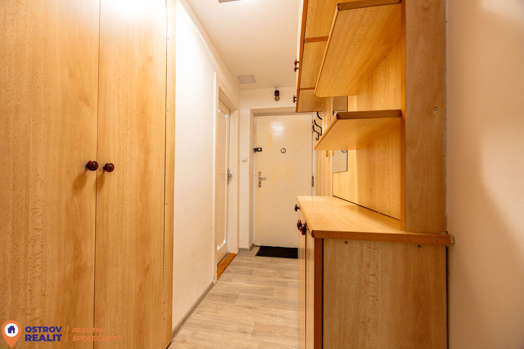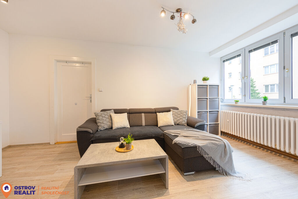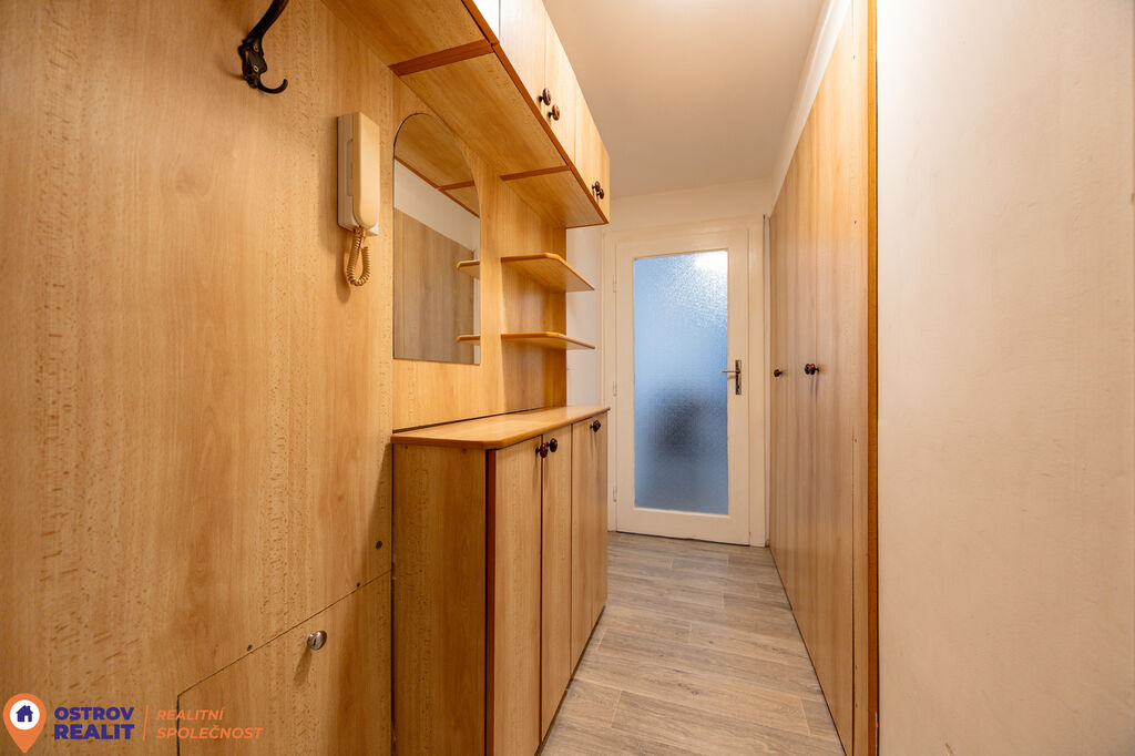 Dominantou bytu je prostorný obývací pokoj s kuchyňským koutem, kde je možné umístit jídelní stůl, rohovou sedačku i obývací stěnu. Na něj navazuje samostatná ložnice, která poskytuje klidné zázemí pro odpočinek. Velkou výhodou je zazděná lodžie, která je díky velkým oknům světlá a funkčně využitelná jako pracovna, malá dětská herna nebo malý pokoj pro hosty. Koupelna je vybavena vanou a toaletou, přičemž je zde prostor i pro pračku. Dispozici doplňuje vstupní chodba s možností umístění vestavěných skříní.