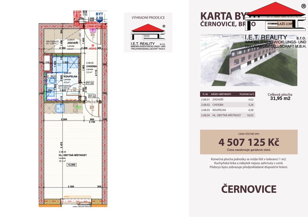 Nabízíme k prodeji nový byt s označením 2.08 o dispozici 1+kk v právě vznikajícím projektu Bytový dům Faměrovo náměstí v Brně. Byt o celkové výměře 31,95 m² se nachází v moderní novostavbě s důrazem na kvalitní provedení, funkční dispozice a moderní městské bydlení. K bytu dále náleží jedno parkovací místo v 1.NP tohoto bytového domu za cenu 583.245,- Kč, které není zahrnuto v kupní ceně. Po dohodě lze zakoupit i více parkovacích míst.