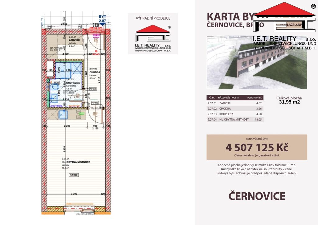 Nabízíme k prodeji nový byt s označením 2.07 o dispozici 1+kk v právě vznikajícím projektu Bytový dům Faměrovo náměstí v Brně. Byt o celkové výměře 31,95 m² se nachází v moderní novostavbě s důrazem na kvalitní provedení, funkční dispozice a moderní městské bydlení. K bytu dále náleží jedno parkovací místo v 1.NP tohoto bytového domu za cenu 583.245,- Kč, které není zahrnuto v kupní ceně. Po dohodě lze zakoupit i více parkovacích míst.