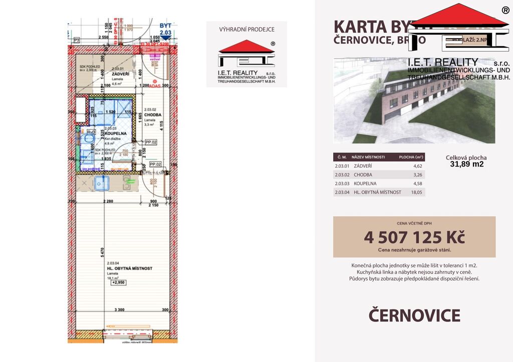 Nabízíme k prodeji nový byt s označením 2.03 o dispozici 1+kk v právě vznikajícím projektu Bytový dům Faměrovo náměstí v Brně. Byt o celkové výměře 31,89 m² se nachází v moderní novostavbě s důrazem na kvalitní provedení, funkční dispozice a moderní městské bydlení. K bytu dále náleží jedno parkovací místo v 1.NP tohoto bytového domu za cenu 583.245,- Kč, které není zahrnuto v kupní ceně. Po dohodě lze zakoupit i více parkovacích míst.