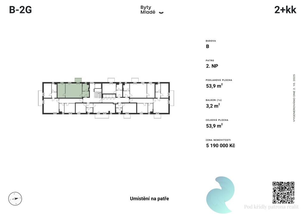 Nabízený byt č. B-2G o dispozici 2+kk, výměře 53,9 m2 a balkonem 3,2 m2, se nachází v prvním patře budovy B. Disponuje vstupní chodbou, koupelnou, obývacím pokojem s kuchyňským koutem a neprůchozím pokojem.