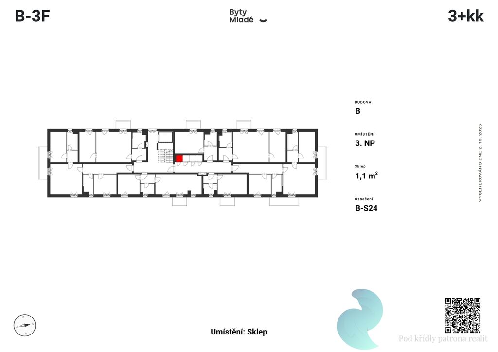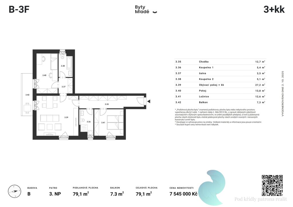 Nabízený byt č. B-3F o dispozici 3+kk, výměře 79,1 m2 a balkonem 7,3 m2, se nachází v druhém patře budovy B. Disponuje vstupní chodbou, koupelnou, obývacím pokojem s kuchyňským koutem, dvěma neprůchozími pokoji, samostatnou toaletou a šatnou.