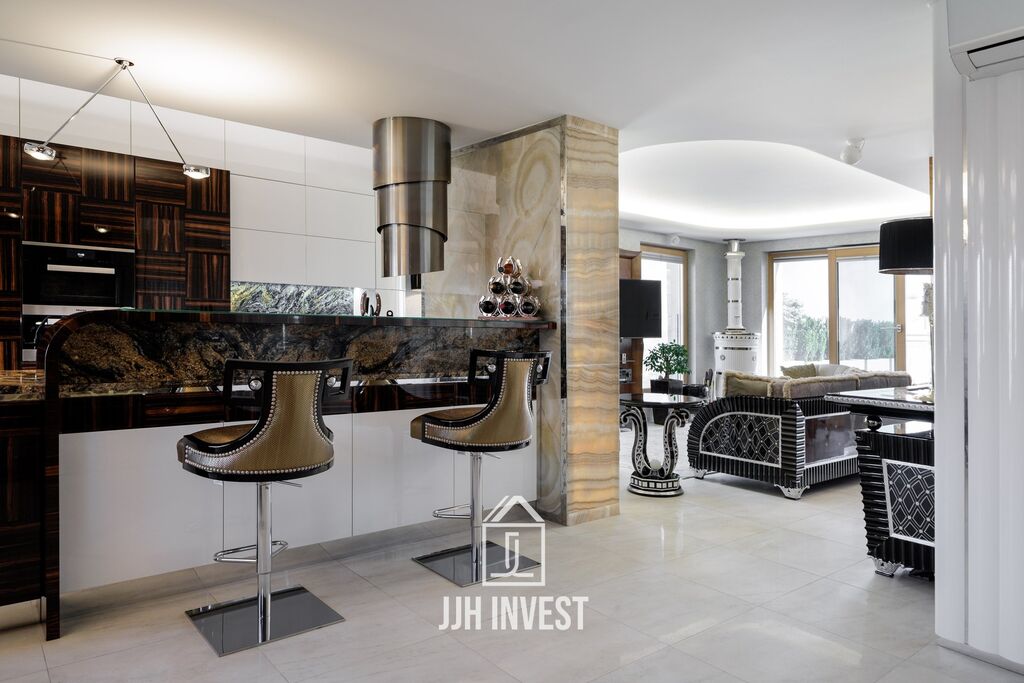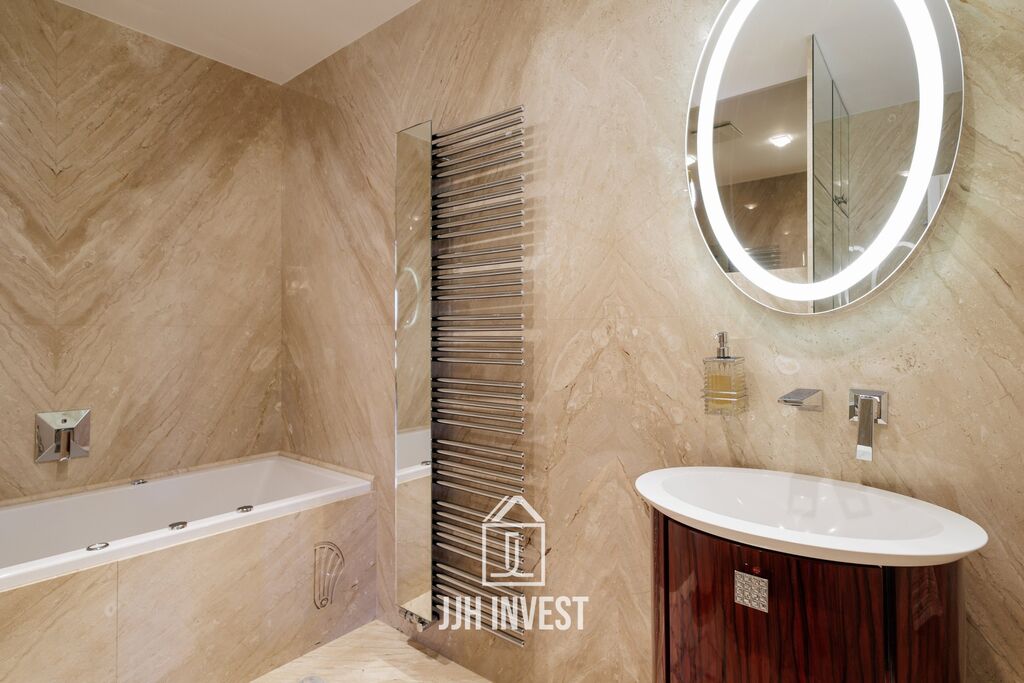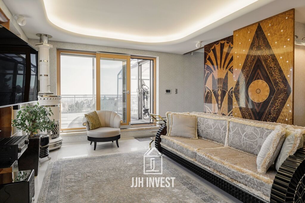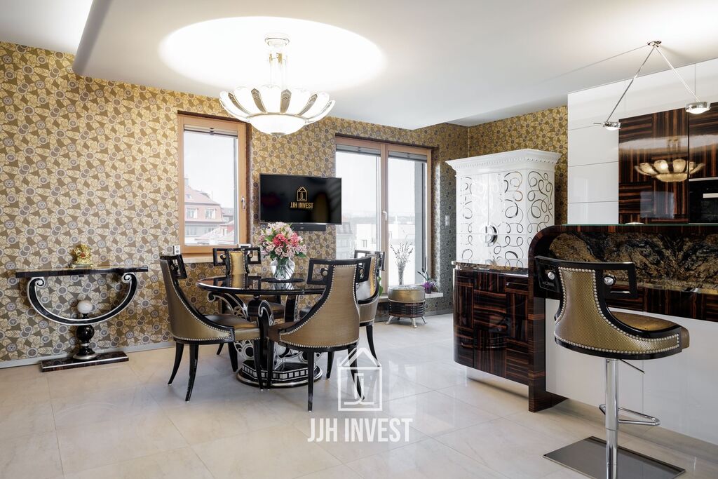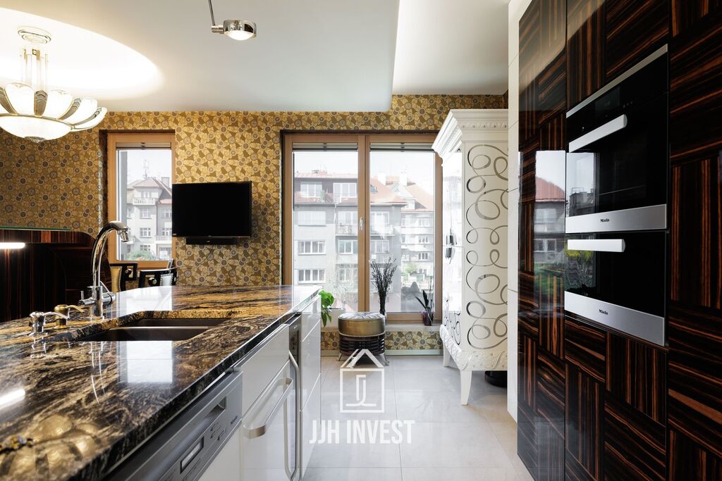 Interiér? Nadčasové Art Deco, laděné do posledního detailu. Designové značky jako Carpanelli, světla Fendi, postel Hästens, podsvícený onyx v obývacím pokoji nebo schodiště z masivního mramoru – každý prvek má svou kvalitu i příběh. Podlahové vytápění po celém bytě doplňují stylová krbová kamna pro atmosféru.