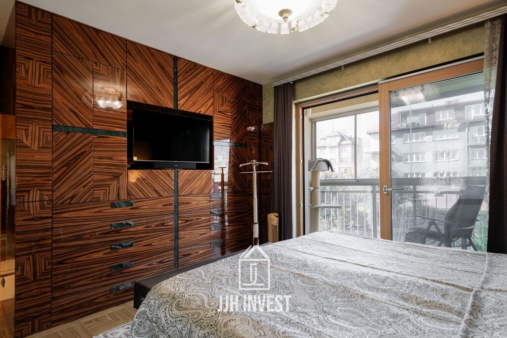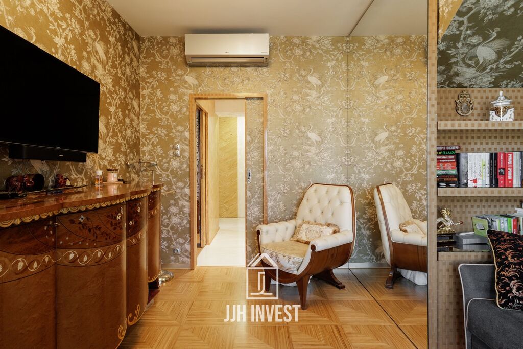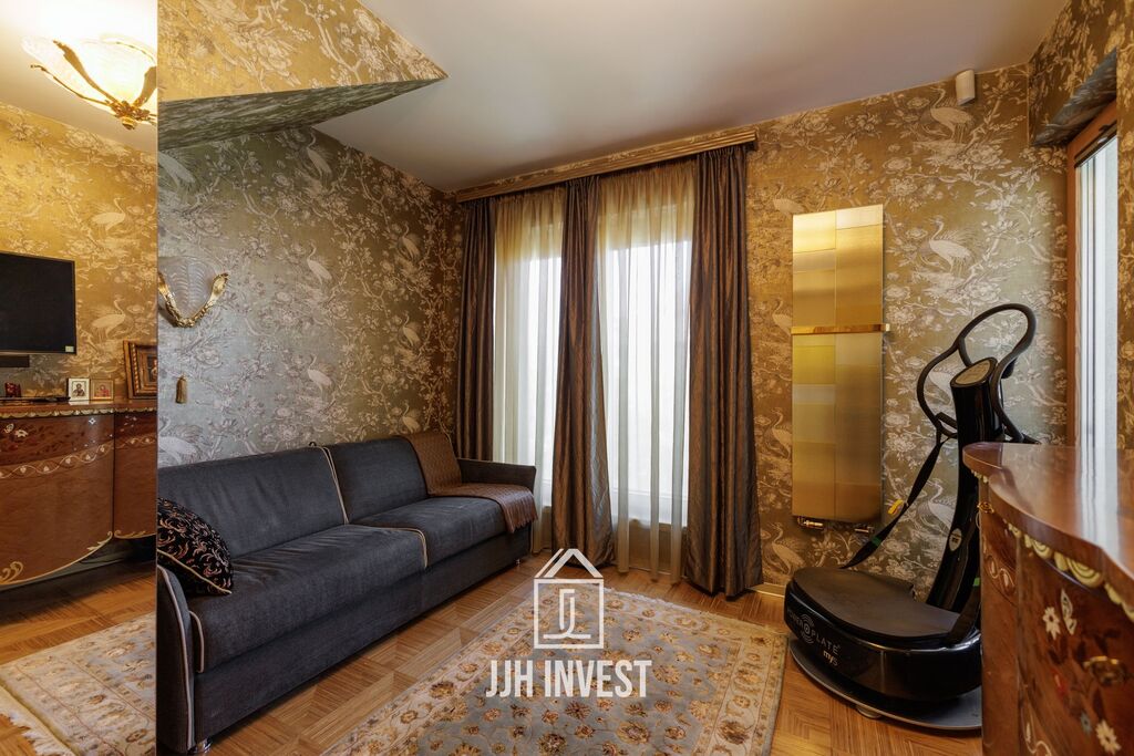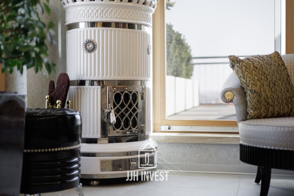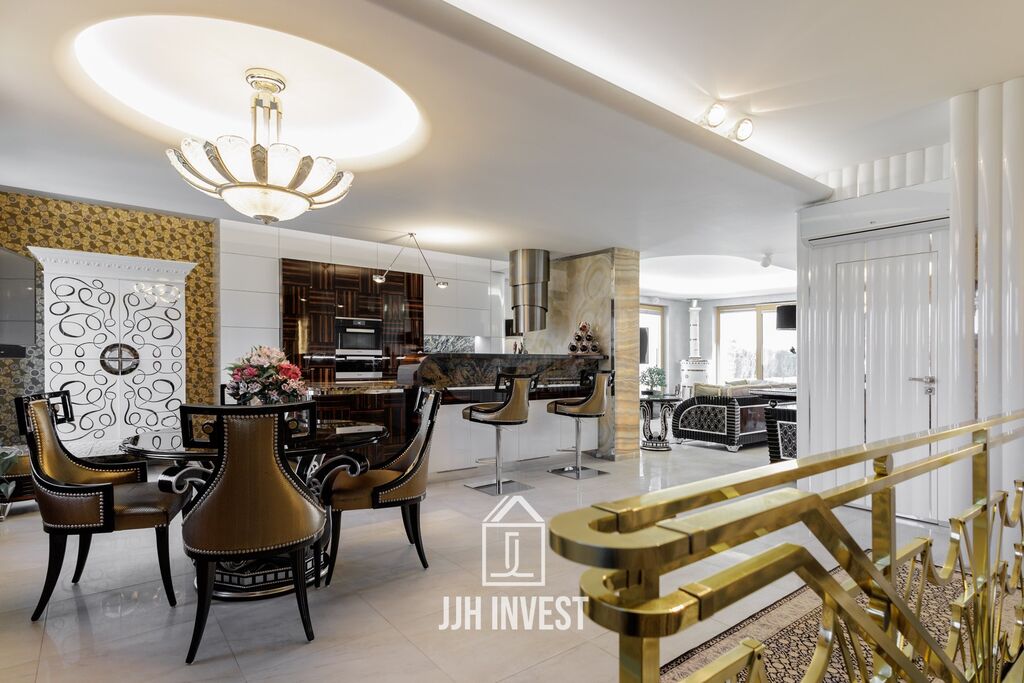 Interiér? Nadčasové Art Deco, laděné do posledního detailu. Designové značky jako Carpanelli, světla Fendi, postel Hästens, podsvícený onyx v obývacím pokoji nebo schodiště z masivního mramoru – každý prvek má svou kvalitu i příběh. Podlahové vytápění po celém bytě doplňují stylová krbová kamna pro atmosféru.