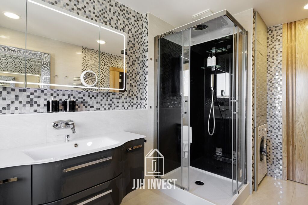 Dvě koupelny, každá na jiném patře. Spodní s párou, sprchou a saunou z cedrového dřeva, horní s masážní vanou. Vše doplněno vybavením prémiových značek, kamennými obklady a promyšleným úložným prostorem.