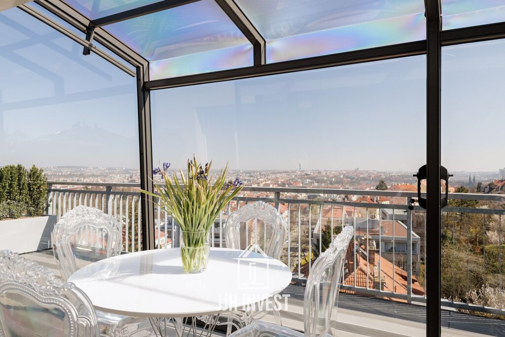 Z bytu ve 2 podlažích (6. a 7. patro) vystoupíte přímo na soukromou terasu 48 m2, která vám otevře Prahu jako na dlani – od Strahova až po Pankrác. Další balkon u ložnice (4 m2) je ideálním místem pro ranní kávu nebo večerní klid.