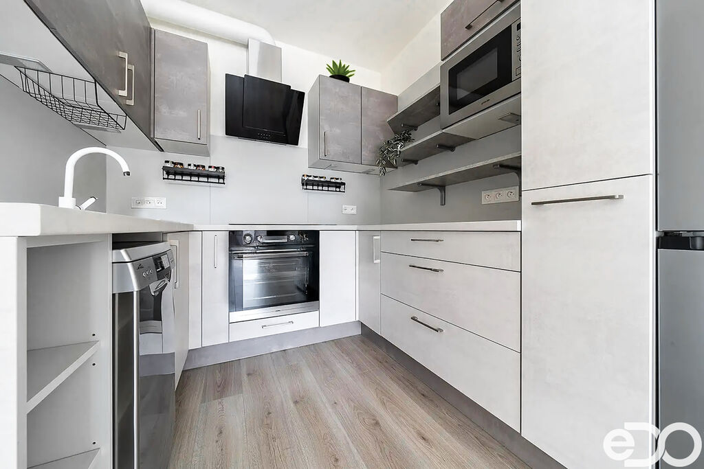 Kuchyňská linka na míru je vybavena spotřebiči (myčka, varná deska, elektrická trouba, digestoř, dřez, samostatně stojící lednice). Na všech oknech jsou nainstalovány elektrické venkovní žaluzie na dálkové ovládání. Vybavení bytu: skříň a předsíňová stěna, jinak je byt nevybaven, což vám umožní zařídit si ho podle vlastních představ.