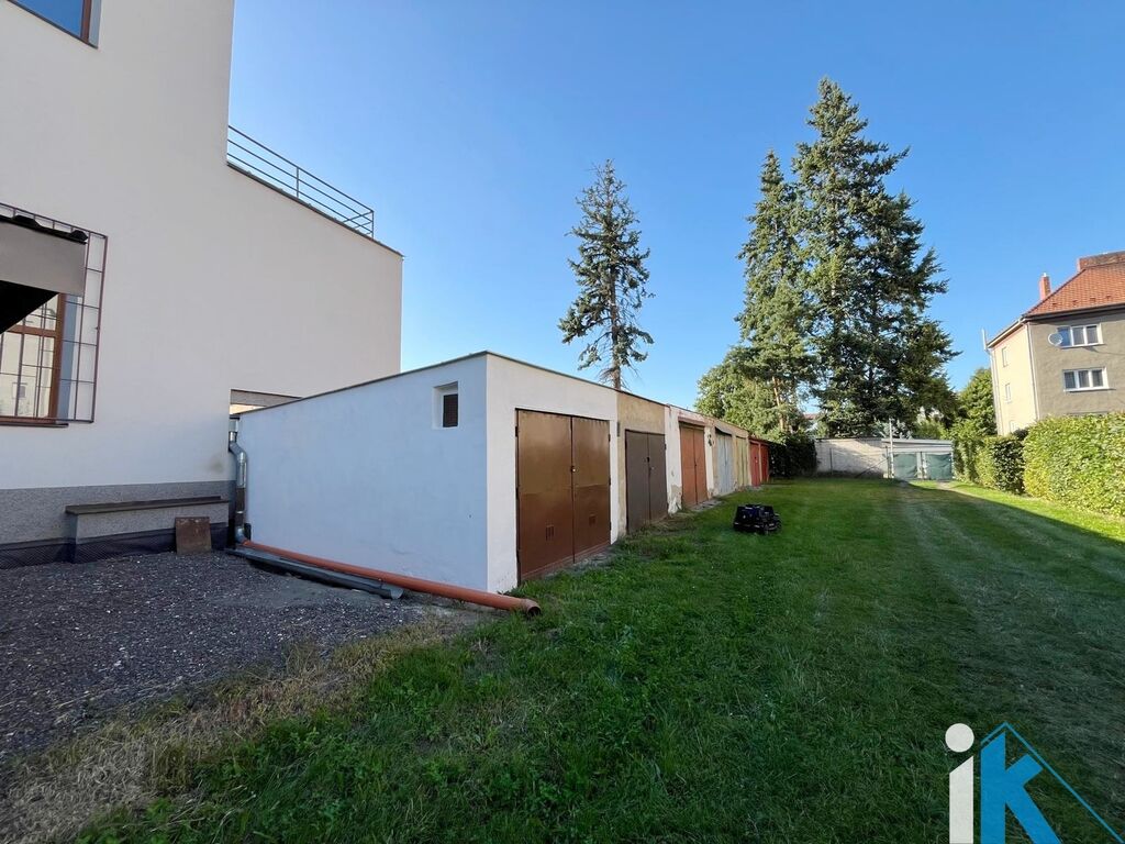 Nabízíme cihlovou garáž s plechovými vraty. Vjezd je od okolní zástavby oddělený společnou železnou bránou.