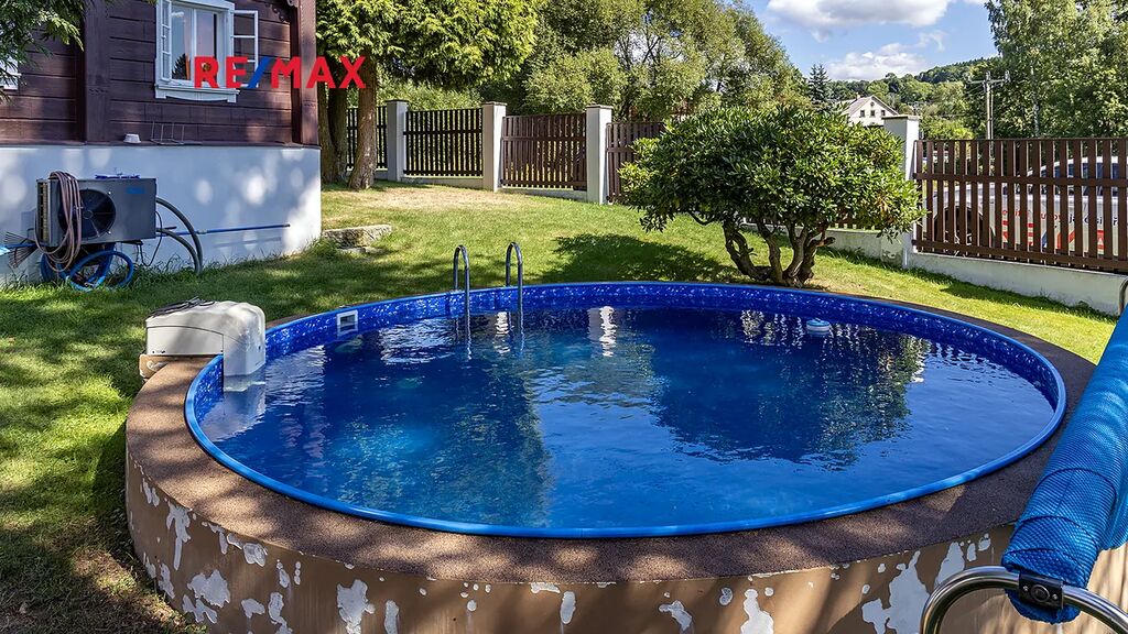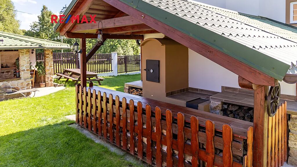 K chalupě náleží zahrada optimální velikosti, která vám poskytne dostatek soukromí i prostoru pro odpočinek. V létě oceníte bazén, který se postará o osvěžení v horkých dnech, a k venkovnímu stolování je připraveno posezení na dlážděné terase, dále kryté posezení s krbem a samostatná udírna.. Nechybí ani garáž, ideální pro uskladnění zahradního náčiní či sportovního vybavení.