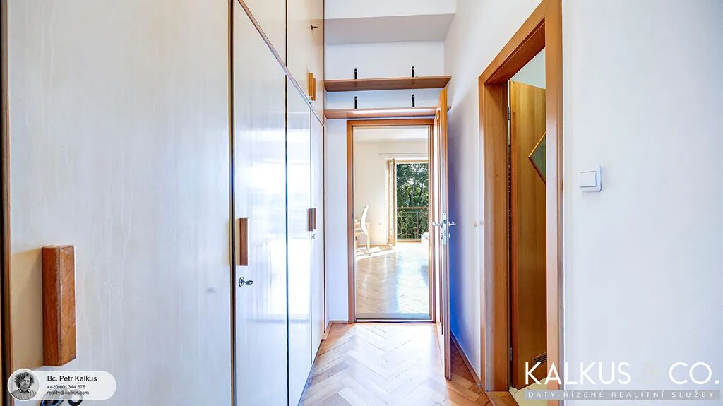 Čistý modernizovaný interiér si zachovává některé své původní interiérové prvky ze 40. let včetně příjemných dubových parket. Dispozice sestává z prostorné předsíně, obývacího pokoje s otevřenou kuchyní, dvou samostatných pokojů (jeden s francouzským oknem, druhý se vstupem na lodžii), koupelny s vanou, odděleného WC a praktické komory. Kuchyně / obývací pokoj je vybaven varnou deskou, horkovzdušnou troubou, volně stojící lednicí digestoří, k dispozici je pračka, vestavné skříně v chodbě, botník v předsíni, regály v komoře, šatní skříň v pokoji. Okna jsou dřevná euro. Parkování je možné přímo u domu za 1 200 Kč / rok.