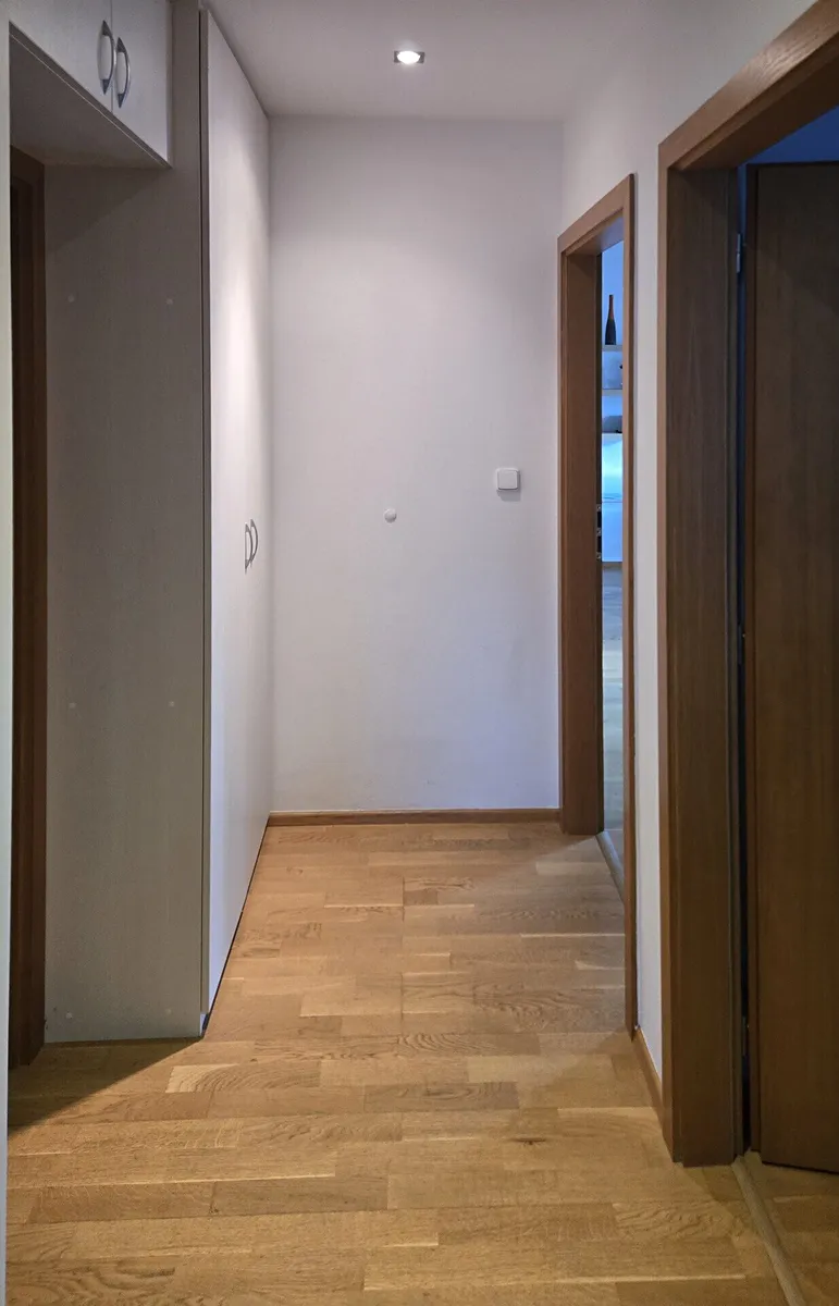 Ve všech obytných místnostech jsou dřevěné parkety, v předsíni u vstupu + v části kuchyně je marmoleum, v koupelně a na samostatném WC keramická dlažba. V celém bytě je stropní osvětlení, na oknech garnýže a záclony + závěsy. Byt je pronajímán včetně výše uvedeného vybavení a zařízení.