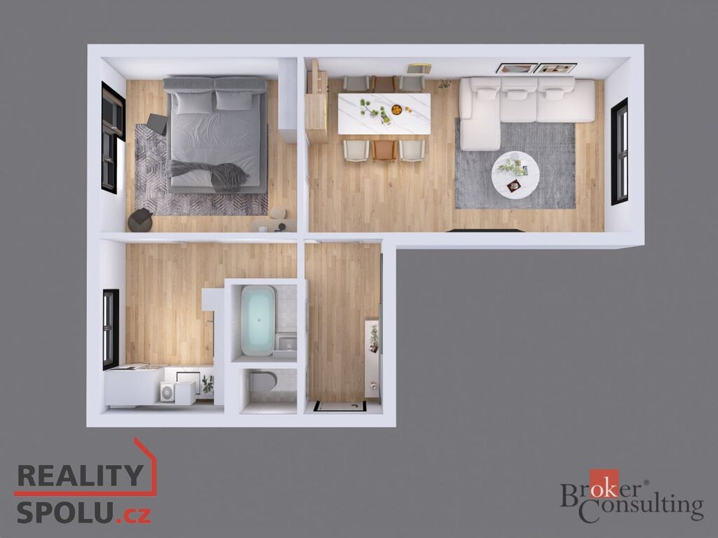 Byt disponuje praktickou dispozicí – dvě samostatné obytné místnosti, kuchyň, koupelna a toaleta. K bytu náleží také balkon, který poskytuje příjemné místo k odpočinku, a sklep, ideální pro uskladnění věcí.