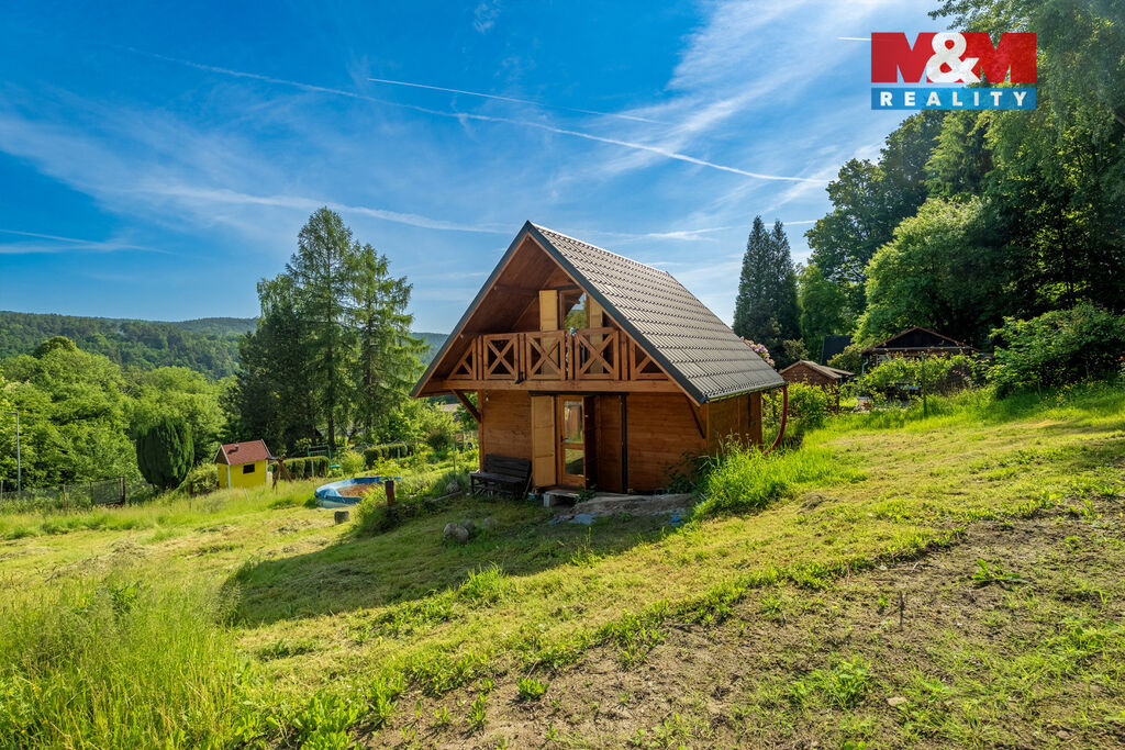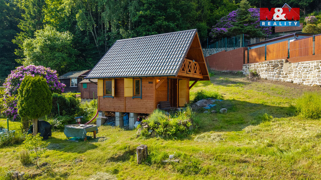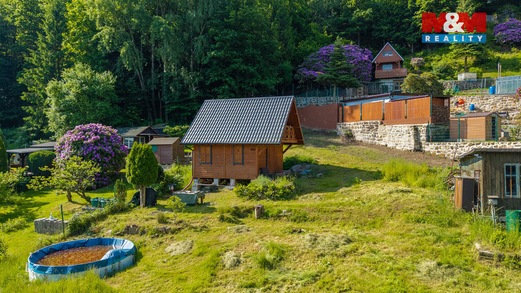 Vážení zájemci! Dovolte nám nabídnout k prodeji kouzelnou dřevěnou chatu s balkonem na velmi klidném místě klidné části obce Děčína - Dolní Oldřichov. Celoroční zateplená chata z roku 2021 o užitné ploše 40 m² s kompletně rozvedenou elektřinou nabízí tři místnosti rozložené do dvou nadzemních podlaží a je připravená k okamžitému užívání. K vysněnému odpočinku nebo zahradničení Vám nemovitost nabízí pozemek o rozloze 624 m², kde se také nachází čtyři ovocné stromy - hrušeň, jabloň, slivoň, meruňka a dále 3 keře kanadských borůvek. Součástí prodeje je veškeré vybavení včetně bazénu a dětské chatičky. Vytápění zde majitelé řešili pomocí infrapanelů, ale je pouze na Vás, jakým způsobem si to zařídíte právě Vy. Samozřejmostí je zde možnost využití užitkové vody přímo u vstupu na pozemek. Zaujalo Vás to? Proto zavolejte ještě dnes, domluvte si termín prohlídky a přesvědčte se o přednostech této nemovitosti osobně.