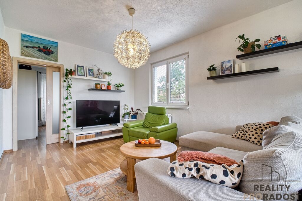 Interiér je tvořen prostorným obývacím pokojem, kuchyní, samostatnou ložnicí, koupelnou s toaletou a chodbou. K bytu náleží zděný sklep.