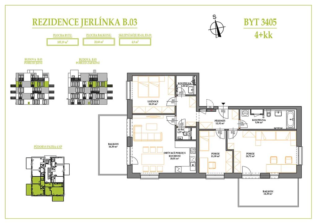 Byt o dispozici 4+kk se nachází ve 4. NP bytového domu č.3 o podlahové ploše 105,19 m2.