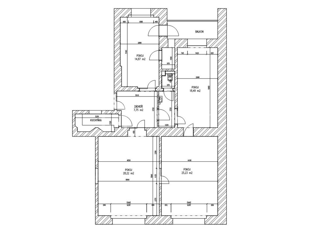 Prostory se skládají ze 4 místností (28m²+25m²+18m²+15m²), samostatné kuchyňky, dále pak z chodby, komory, wc a lodžie.