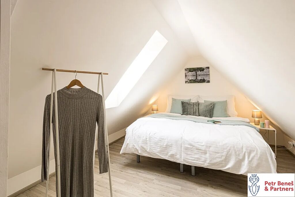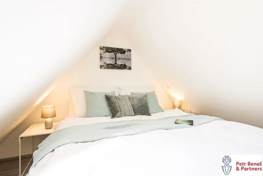 • po schodech pak vystoupáte do podkrovní ložnice, která nabízí klidný prostor na spaní a odděluje zónu odpočinku od denního života,