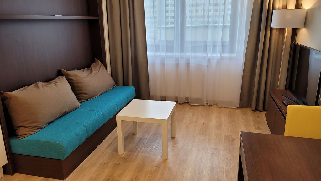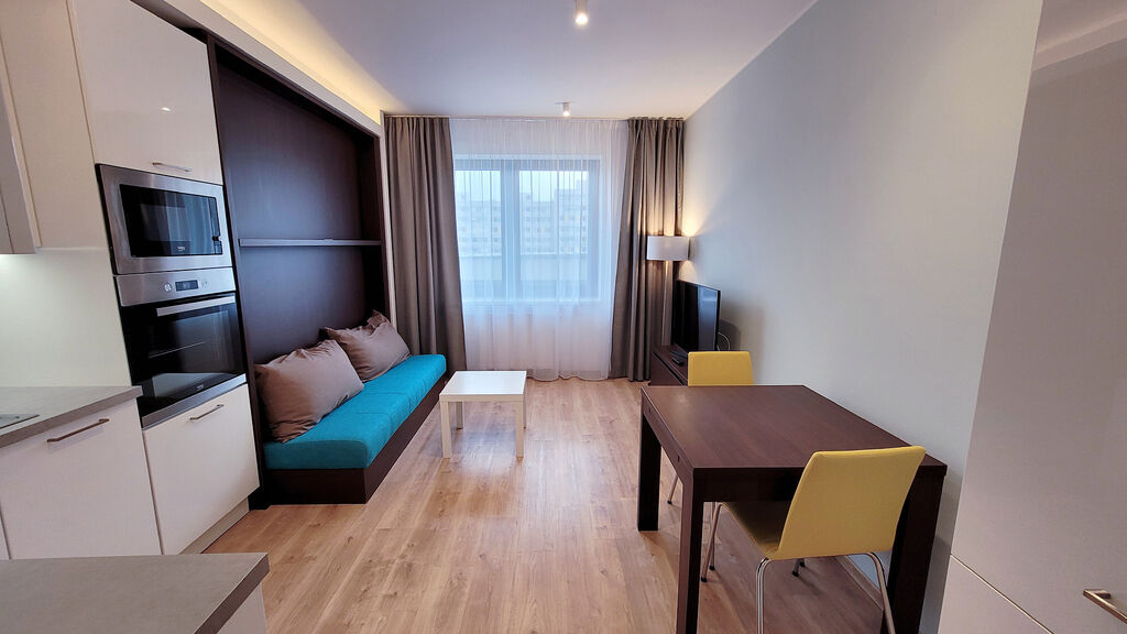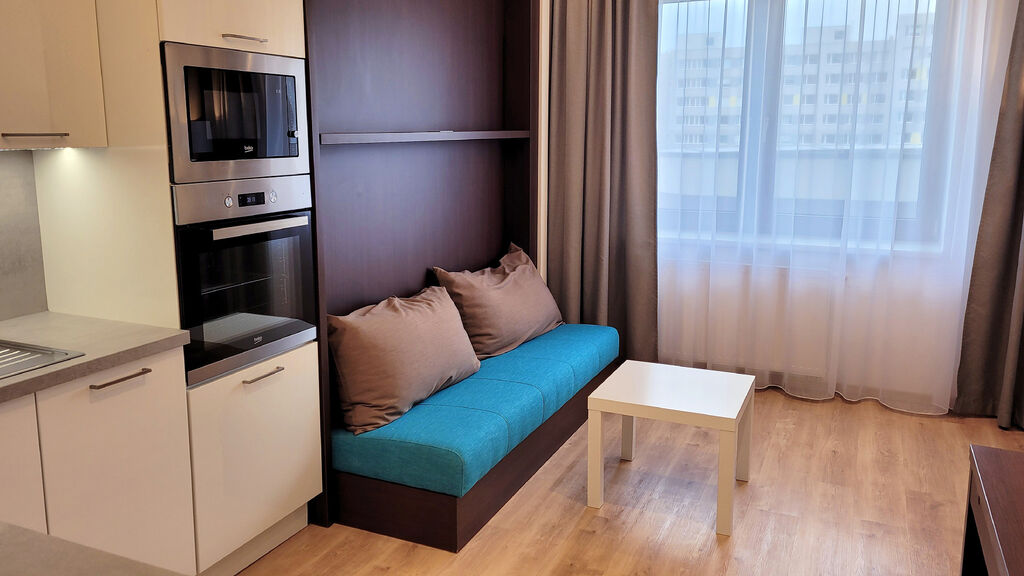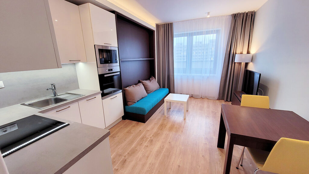 Útulný byt č.702 o dispozici 1kk v 7.NP, kompletně zařízený se všemi elektrospotřebiči. Navíc moderní obývací sofa s integrovanou sklápěcí postelí Vám celý byt opticky výrazně zvětší. Součástí bytu je rovněž komfortní nepřímé LED osvětlení a zdravotní matrace! V koupelně vana i bidet.