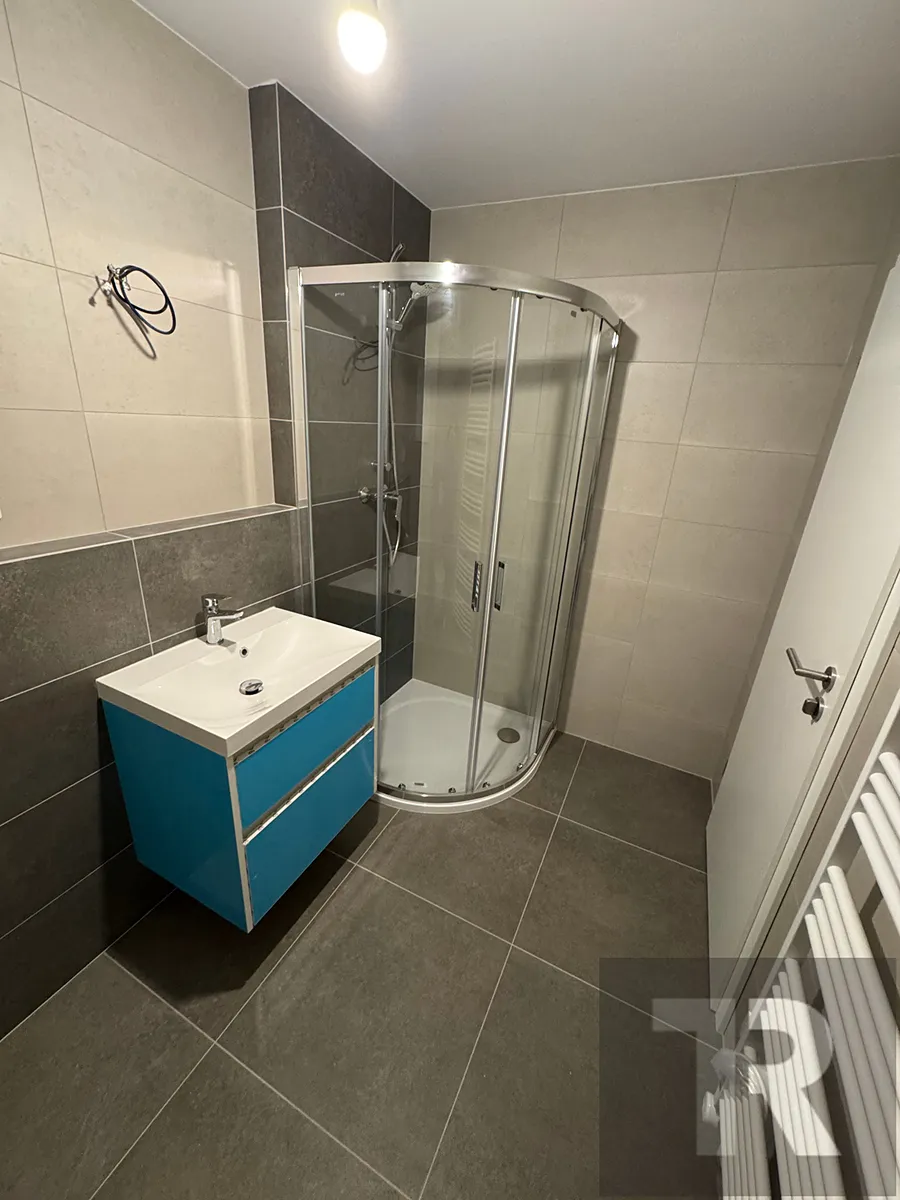 Dispozice: předsíň, obývací pokoj s kuchyňským koutem (sklokeramická varná deska, digestoř, myčka, el. trouba, lednice s mrazákem, jídelní stůl + 4 židle) s výstupem na balkon (orientace na V), ložnice s vestavěnou skříní, koupelna se sprchovým koutem a WC.