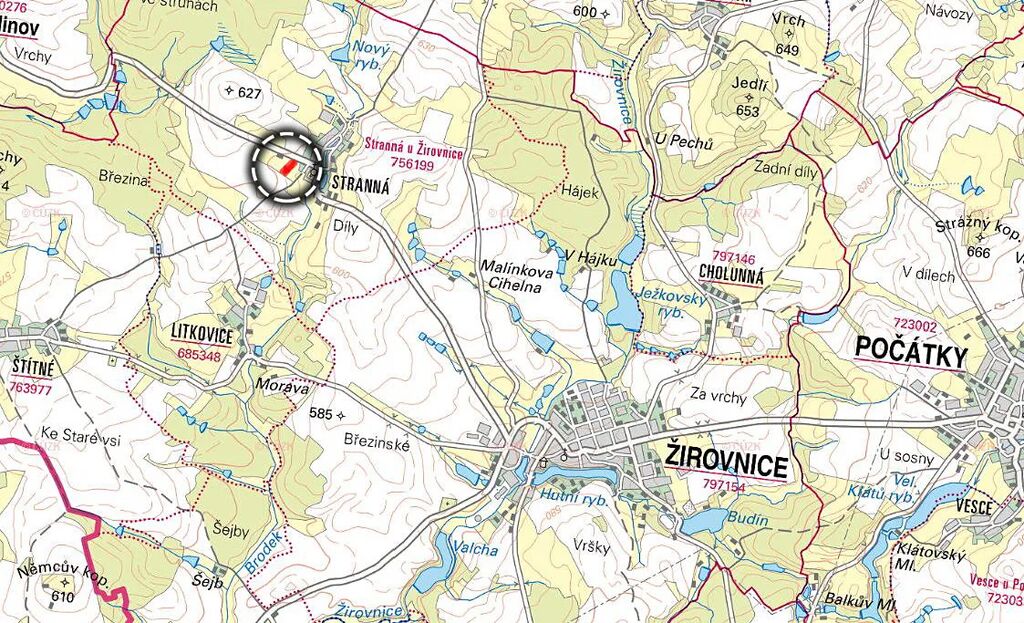 Pozemky jsou zapsány na listu vlastnictví 911 pod čísly parcel 993/1, 993/2, 994/1 a 994/2 v katastrálním území Stranná u Žirovnice. Ve stavební ploše leží konkrétně pozemky 993/1 a 994/1 a to asi z jedné - přední -poloviny. Ve zbytku výměry jsou pozemky označeny jako zeleň, tedy zahrada nebo sad. Plocha je zakončena porostem poskytujícím soukromí a oddělující zemědělskou půdu.