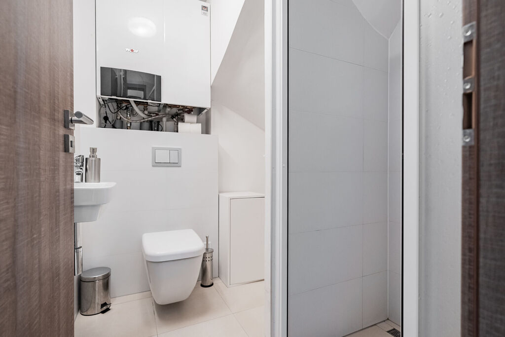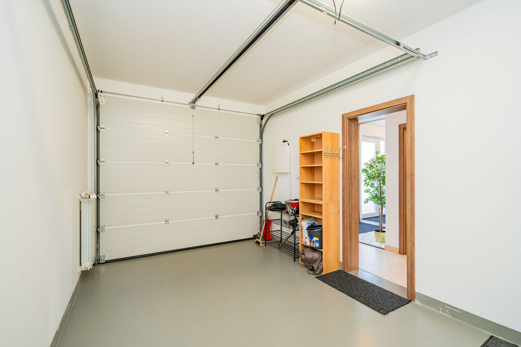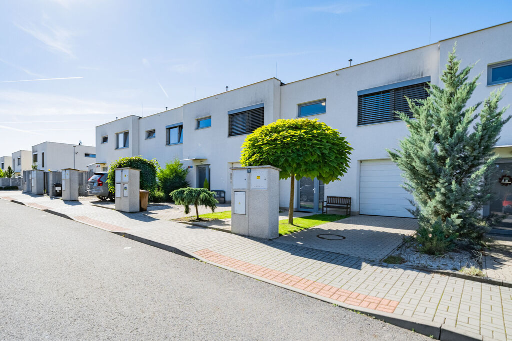 V přízemí domu je obývací pokoj s jídelnou, kuchyní, vstupem na terasu domu a dále do zahrady. Kuchyňská linka je vybavena spotřebiči ( varná deska, digestoř, trouba, mikrovlnná trouba, myčka nádobí, lednice, mrazák). Garáž domu je přístupná vraty na dálkové ovládání a je prakticky propojena dveřmi s interiérem domu, což poskytuje pohodlí v rámci nákupů a umožňuje jednoduché využití garáže v rámci úložného prostoru. V přízemí domu je vstupní chodba, koupelna se sprchou a toaletou. Patro domu má tři samostatné pokoje. V ložnici jsou vestavné skříně. Pokoje je možno využít dle vlastní potřeby, jako dětské pokoje, ložnice či pracovnu. V patře domu je další koupelna se sprchovým koutem a vanou. Toaleta je zde samostatná. V domě jsou předokenní žaluzie. Zahrada domu je velmi pečlivě udržovaná, rovinatá, zatravněná se vzrostlými stromy, dřevinami. Za zmínku stojí také maliny a rybíz. Zahrada má jednoduchý systém zavlažování. Výhodou je úložný domeček a především zastřešená terasa domu, která svým využitím reálně zvětšuje plochu domu.