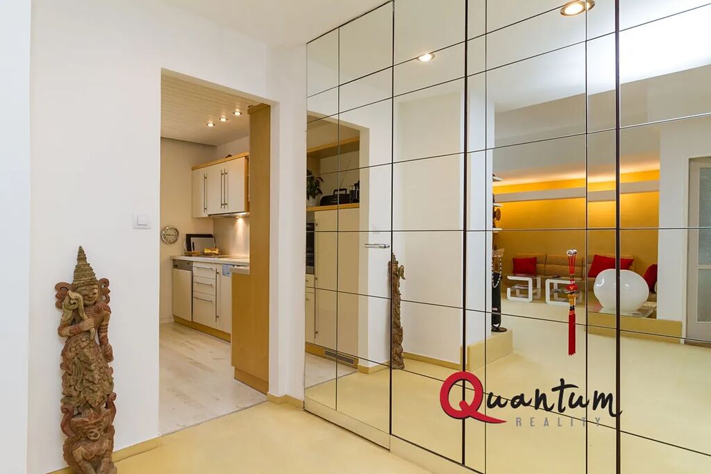 Vybavení: kuchyňská linka s vestavěnými spotřebiči (myčka, lednice, sklokeramická varná deska, elektrická a mikrovlnná trouba, pračka), dále postele (bez matrací), šatní skříně, sedačka, policové systémy, jídelní stůl se židlemi aj. Podlahy tvoří plovoucí podlaha, parkety, dlažba a koberec. K bytu náleží také sklep v suterénu domu.