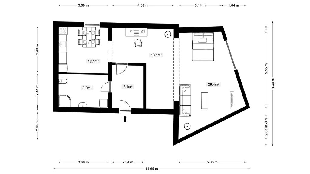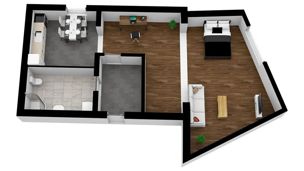Dispozice: vstupní chodba, prostorná koupelna s umyvadlovou skříňkou, sprchovým koutem, WC, velký obývací pokoj s ložnicí a jídelna s vestavnou kuchyní s horkovzdušnou a mikrovlnnou troubou, lednicí, a myčkou, komora. Všechny okna v bytě jsou osazeny vnitřními žaluziemi. K bytu náleží úložná komora o ploše 3 m², která je přístupná vedle vstupu do bytu.