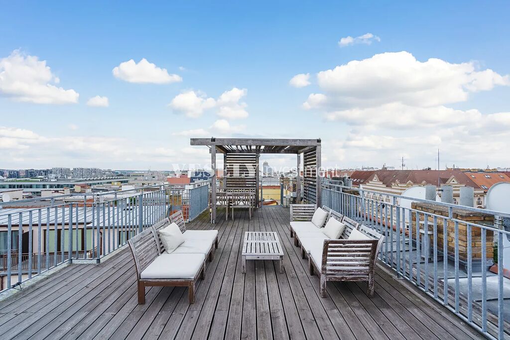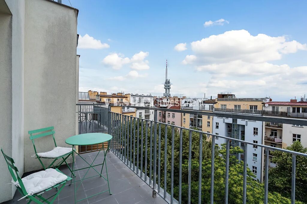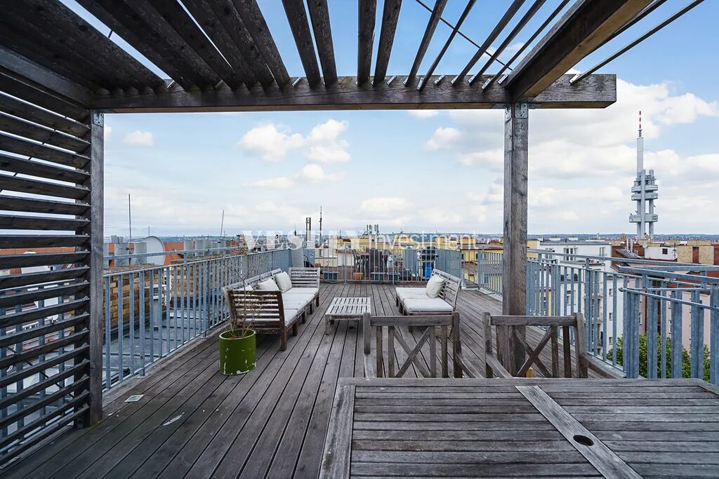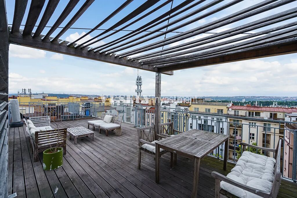 Nabízíme k prodeji unikátní mezonetový byt 4+kk, 139,6 m2 se střešní terasou 50m2 s krásnými výhledy na celé město, poblíž náměstí Jiřího z Poděbrad. Cihlová bytová nadstavba z roku 2006 v klasickém cihlovém domě s výtahem se nachází v 6.NP, 7.NP. a 8NP.