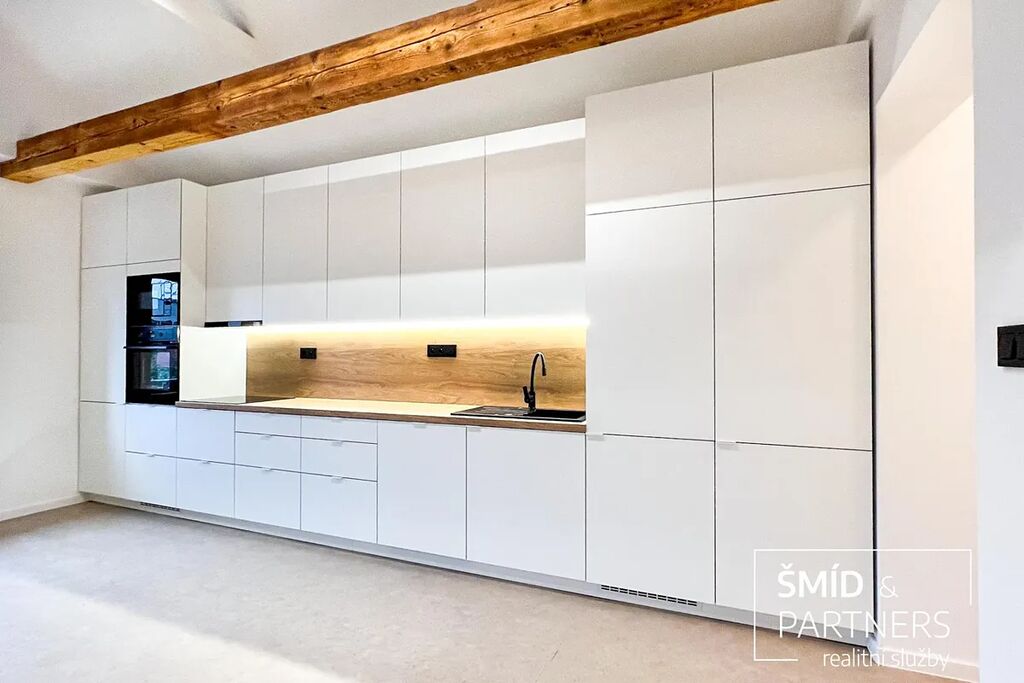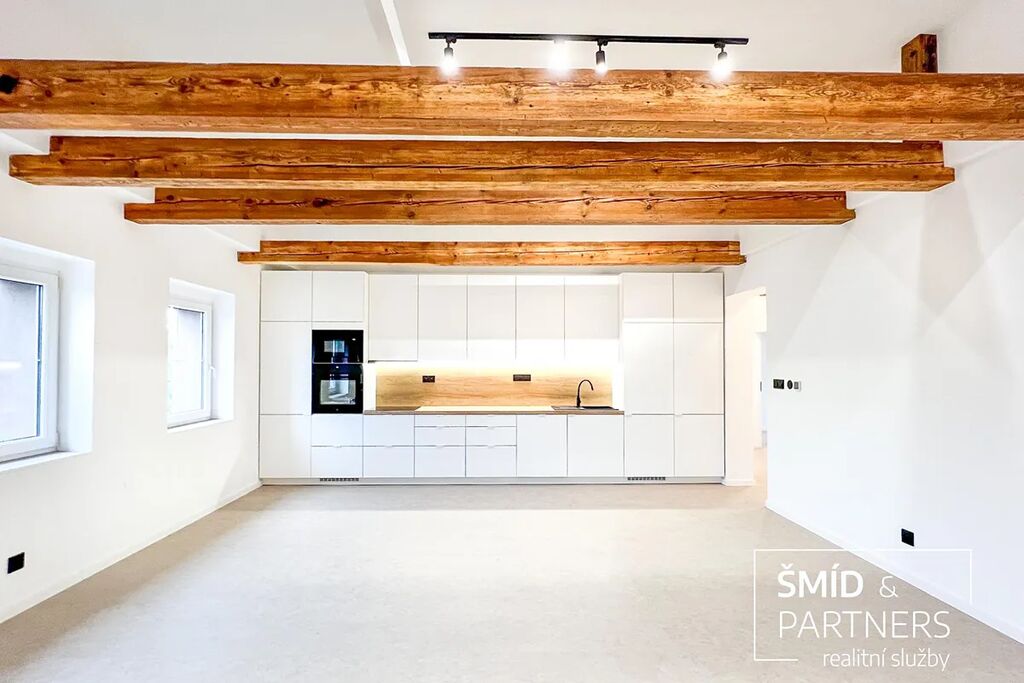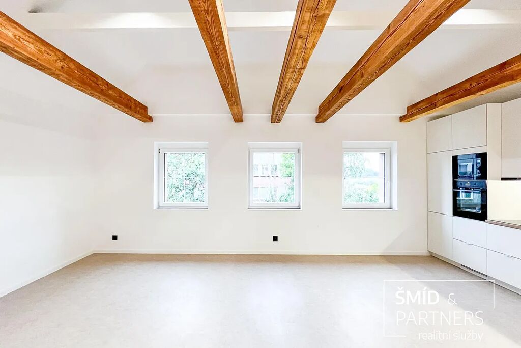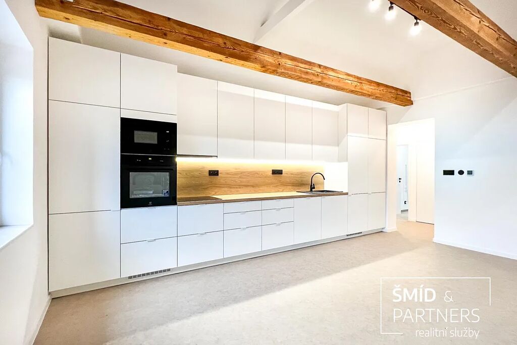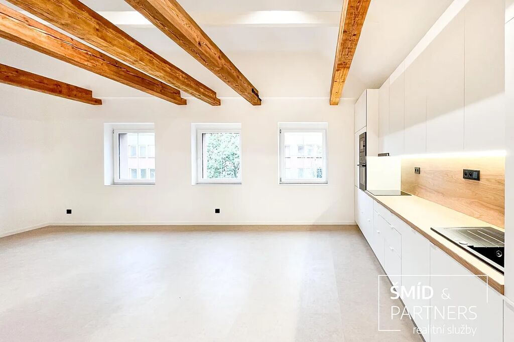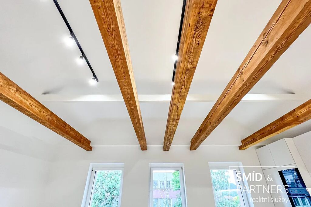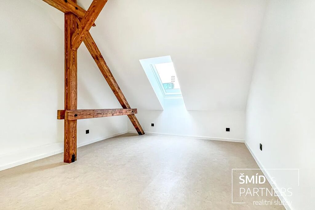 Nabízíme k prodeji krásný byt o rozloze 85 m2 v dispozici 3+kk. Byt právě prošel mimořádně zdařilou rekonstrukcí a je ihned připraven pro nové vlastníky. Jedná se o elegantní podkrovní byt, jehož hlavní a největší místnost, obývací pokoj s kuchyňským koutem, je situován ve vikýři čtyřpodlažního bytového domu. Dvě ložnice a koupelna jsou s krovní šikminou se střešními okny Velux stále výborně prostorově i výškově využitelné. Částečně přiznaná krovní konstrukce propůjčuje místnostem příjemný industriální vzhled, aniž by zásadně omezovala jejich využití. Obývací části dominuje velká, plně vybavená kuchyňská linka s vestavnými spotřebiči (myčka, kombinovaná chladnička, horkovzdušná trouba, varná deska, mikrovlnná trouba, digestoř) a pohledová trámová konstrukce stropů. V chodbě jsou vestavěné úložné skříně. Elektrický bojler o objemu 120 l, který slouží pro ohřev TUV, je ukrytý v podkrovním prostoru koupelny, tak aby vizuálně nerušil decentní a velmi příjemné provedení koupelny. Topení v celém bytě je řešeno el. topnými rohožemi v podlaze s perfektní regulací teplot v jednotlivých místnostech. Odolné vinylové podlahy jsou v celém prostoru barevně sjednocené a umocňují tak celkový luxusní dojem. Byt je v osobním vlastnictví a předpis měsíčních plateb činí rozumných 1.575,- Kč, z čehož fond oprav představuje částku 785,- Kč. Bytový dům je dobře udržovaný, se zateplenou fasádou a po kompletní výměně dřevěných oken za plastová.