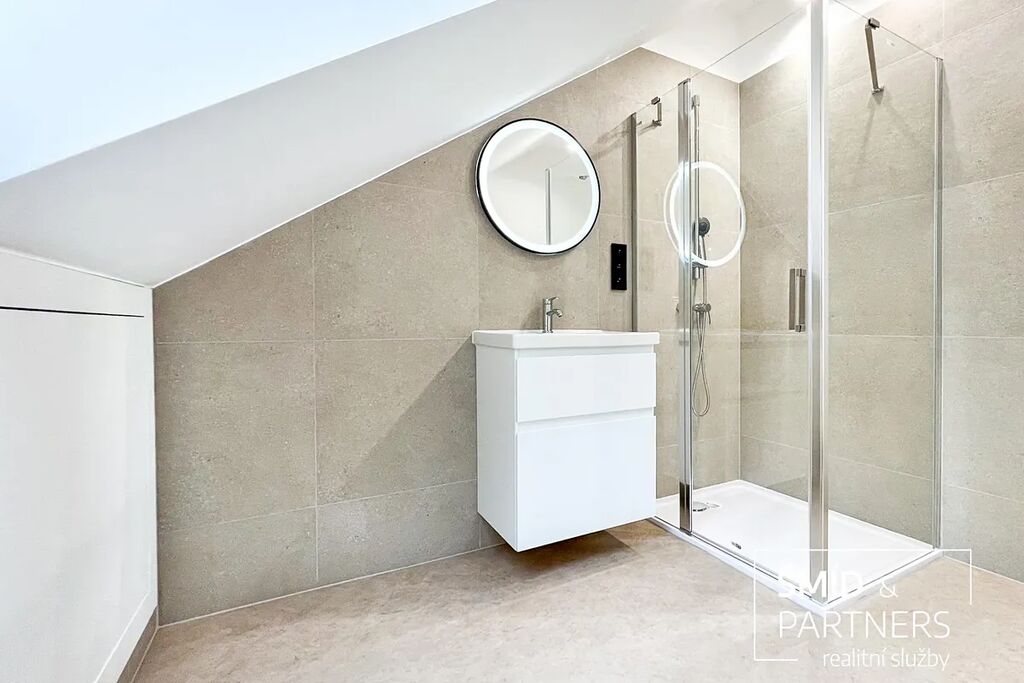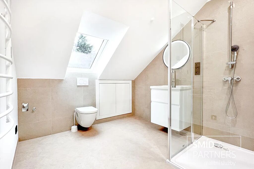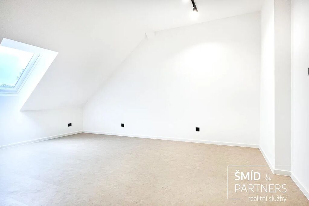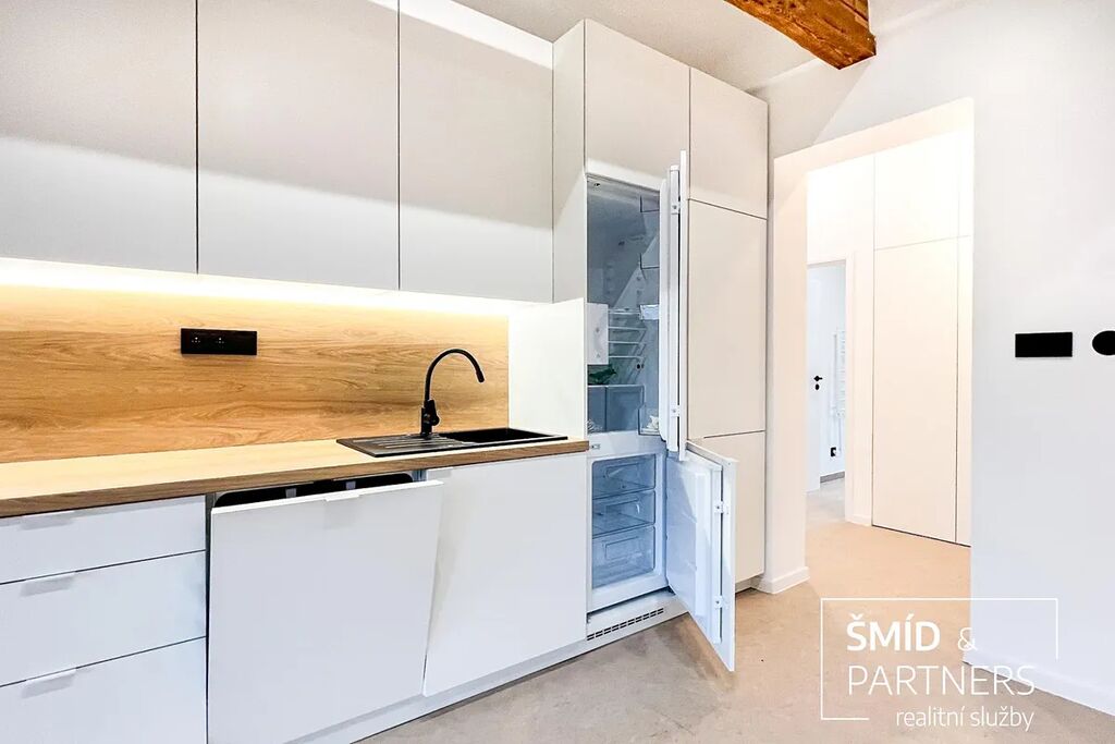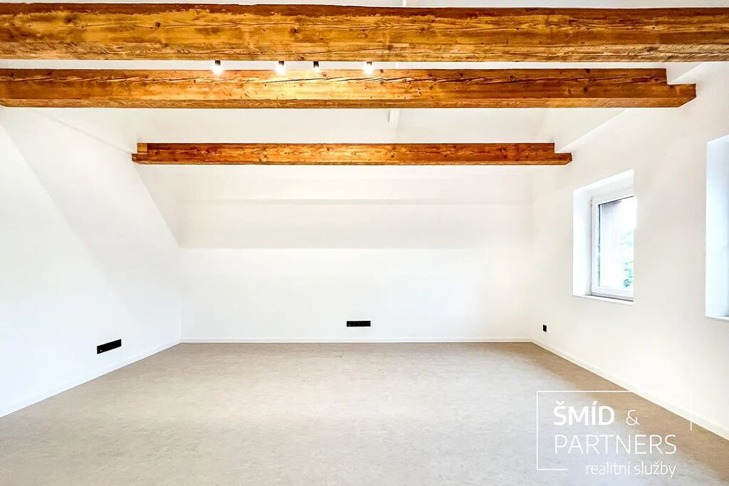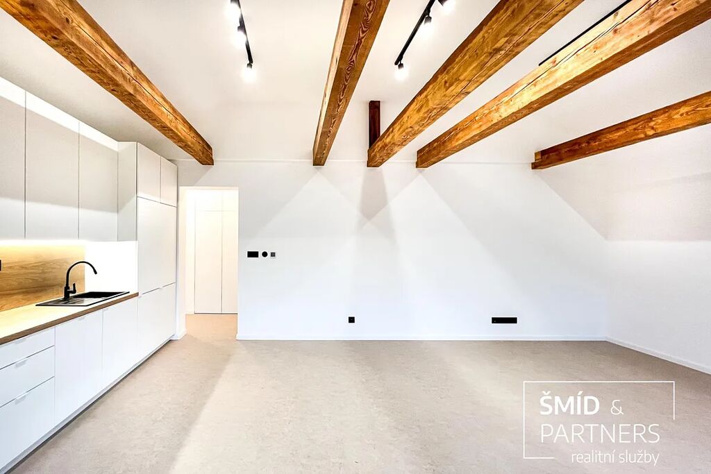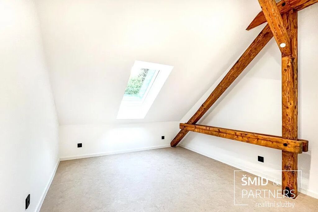 Nabízíme k prodeji krásný byt o rozloze 85 m2 v dispozici 3+kk. Byt právě prošel mimořádně zdařilou rekonstrukcí a je ihned připraven pro nové vlastníky. Jedná se o elegantní podkrovní byt, jehož hlavní a největší místnost, obývací pokoj s kuchyňským koutem, je situován ve vikýři čtyřpodlažního bytového domu. Dvě ložnice a koupelna jsou s krovní šikminou se střešními okny Velux stále výborně prostorově i výškově využitelné. Částečně přiznaná krovní konstrukce propůjčuje místnostem příjemný industriální vzhled, aniž by zásadně omezovala jejich využití. Obývací části dominuje velká, plně vybavená kuchyňská linka s vestavnými spotřebiči (myčka, kombinovaná chladnička, horkovzdušná trouba, varná deska, mikrovlnná trouba, digestoř) a pohledová trámová konstrukce stropů. V chodbě jsou vestavěné úložné skříně. Elektrický bojler o objemu 120 l, který slouží pro ohřev TUV, je ukrytý v podkrovním prostoru koupelny, tak aby vizuálně nerušil decentní a velmi příjemné provedení koupelny. Topení v celém bytě je řešeno el. topnými rohožemi v podlaze s perfektní regulací teplot v jednotlivých místnostech. Odolné vinylové podlahy jsou v celém prostoru barevně sjednocené a umocňují tak celkový luxusní dojem. Byt je v osobním vlastnictví a předpis měsíčních plateb činí rozumných 1.575,- Kč, z čehož fond oprav představuje částku 785,- Kč. Bytový dům je dobře udržovaný, se zateplenou fasádou a po kompletní výměně dřevěných oken za plastová.