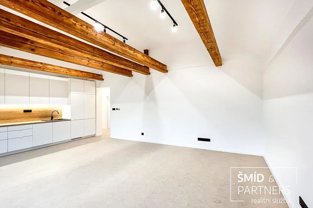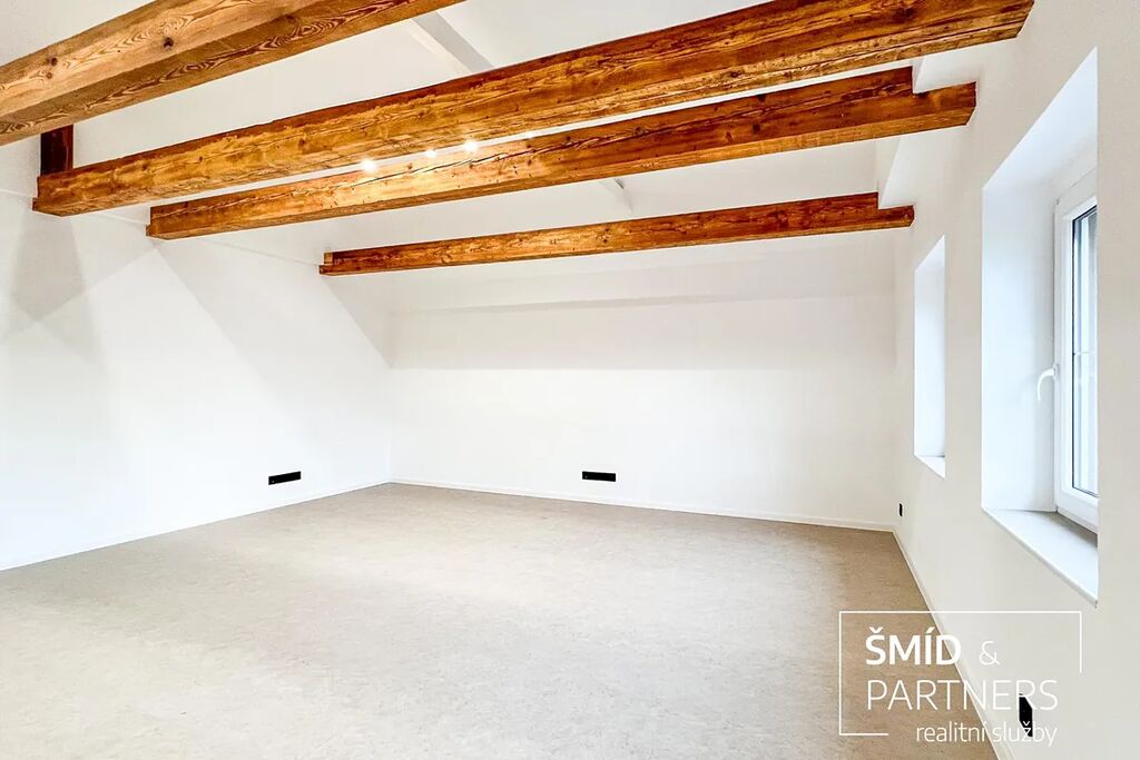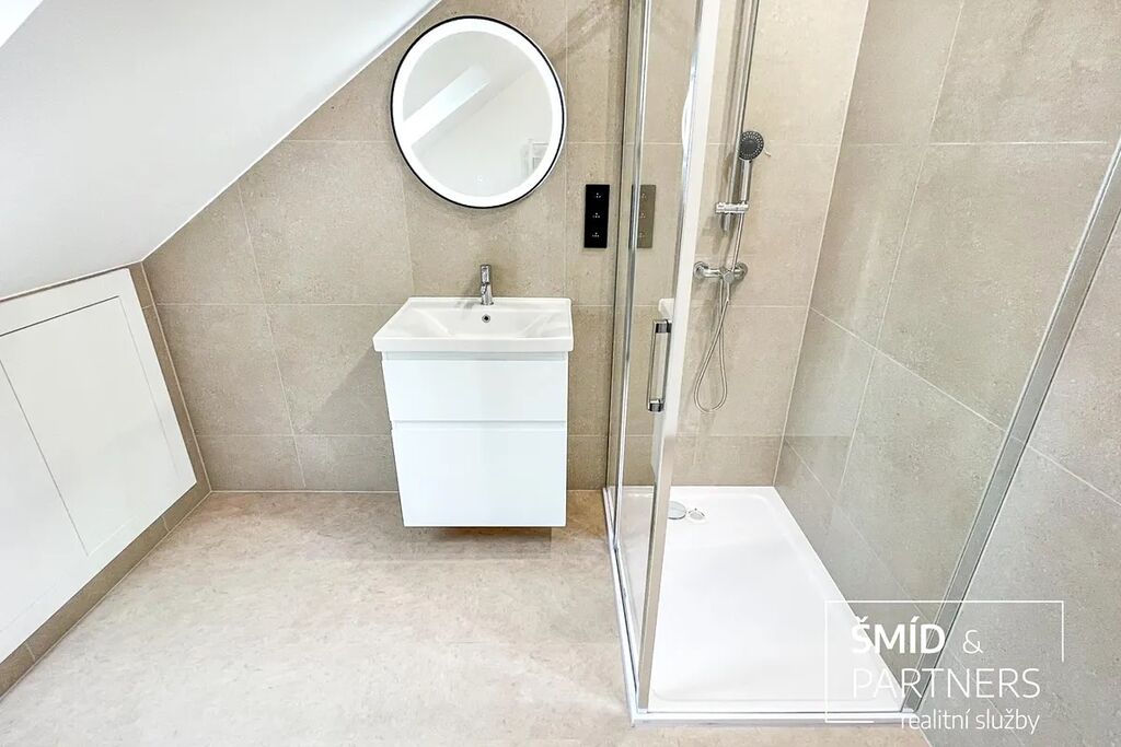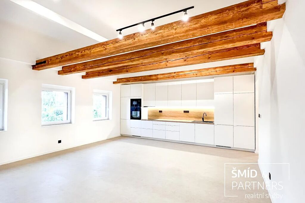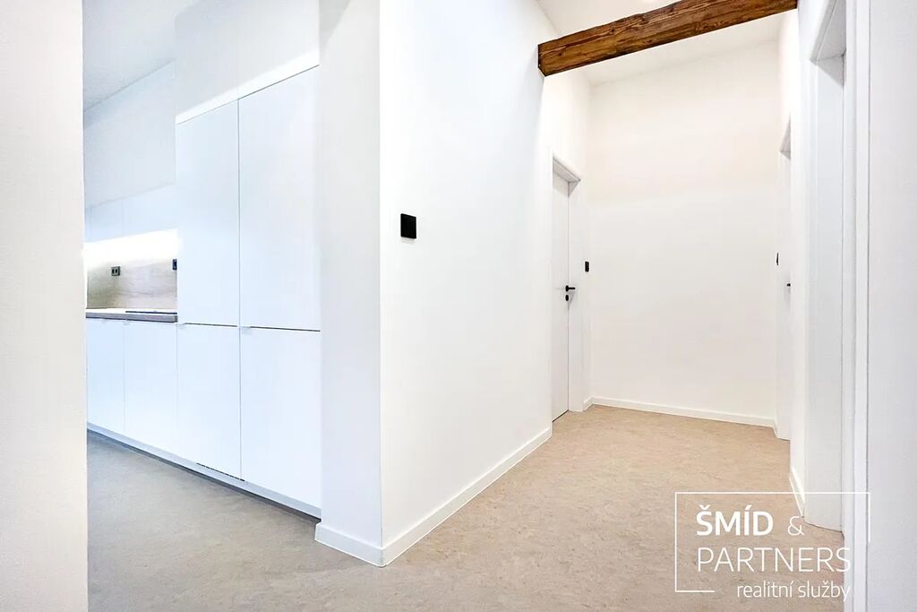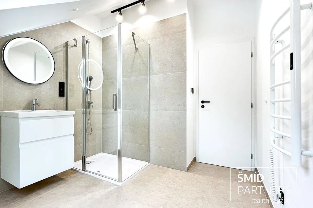 Nabízíme k prodeji krásný byt o rozloze 85 m2 v dispozici 3+kk. Byt právě prošel mimořádně zdařilou rekonstrukcí a je ihned připraven pro nové vlastníky. Jedná se o elegantní podkrovní byt, jehož hlavní a největší místnost, obývací pokoj s kuchyňským koutem, je situován ve vikýři čtyřpodlažního bytového domu. Dvě ložnice a koupelna jsou s krovní šikminou se střešními okny Velux stále výborně prostorově i výškově využitelné. Částečně přiznaná krovní konstrukce propůjčuje místnostem příjemný industriální vzhled, aniž by zásadně omezovala jejich využití. Obývací části dominuje velká, plně vybavená kuchyňská linka s vestavnými spotřebiči (myčka, kombinovaná chladnička, horkovzdušná trouba, varná deska, mikrovlnná trouba, digestoř) a pohledová trámová konstrukce stropů. V chodbě jsou vestavěné úložné skříně. Elektrický bojler o objemu 120 l, který slouží pro ohřev TUV, je ukrytý v podkrovním prostoru koupelny, tak aby vizuálně nerušil decentní a velmi příjemné provedení koupelny. Topení v celém bytě je řešeno el. topnými rohožemi v podlaze s perfektní regulací teplot v jednotlivých místnostech. Odolné vinylové podlahy jsou v celém prostoru barevně sjednocené a umocňují tak celkový luxusní dojem. Byt je v osobním vlastnictví a předpis měsíčních plateb činí rozumných 1.575,- Kč, z čehož fond oprav představuje částku 785,- Kč. Bytový dům je dobře udržovaný, se zateplenou fasádou a po kompletní výměně dřevěných oken za plastová.