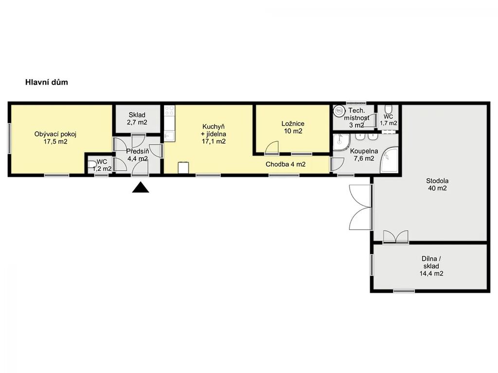 První z domů je typickou venkovskou stavbou s celkovou zastavěnou plochou 177m2, která je rozdělena na obytnou část, jenž prošla zcela zásadní rekonstrukcí a vznikl zde moderní svěží interiér o dispozici 3+kk s celkovou obytnou plochou 70m2 - kuchyňský kout je vybaven kuchyňskou linkou s elektrickou a mikrovlnkou troubou, varnou deskou a digestoří, samostatný obývací pokoj, ložnice, prostorná koupelna s vanou, sprchovým koutem, 2x WC, skladem a technickou místností. Nově jsou taženy rozvody elektřiny, vody, odpady, nová plastová okna, nové vstupní i interiérové dveře, štuky, výmalby. Jako podlahová krytina byl zvolen vysoce zátěžový vinyl, v koupelně, na WC v technické místnosti dlažba. Koupelna je obložena moderními obklady, usazena nová sanita, doplněno atraktivní podsvícení, do technické místnosti usazen bojler na ohřev teplé vody, příprava na umístění pračky a sušičky. Tento dům je částečně podsklepen. Na obytnou část domu navazuje původní hospodářská část s užitnou plochou 54,4m2, která je rozdělena na stodolu a dílnu.