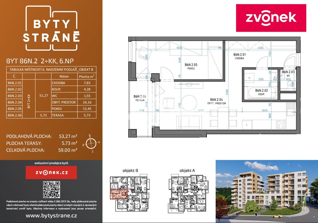 Nabízíme k pronájmu moderní byt 2+kk o celkové výměře 59 m², který se nachází v 6. podlaží nového bytového domu Byty Stráně. Vybaven je novou moderní kuchyňskou linkou se spotřebiči. Na chodbě bude instalována velká vestavěná skříň.