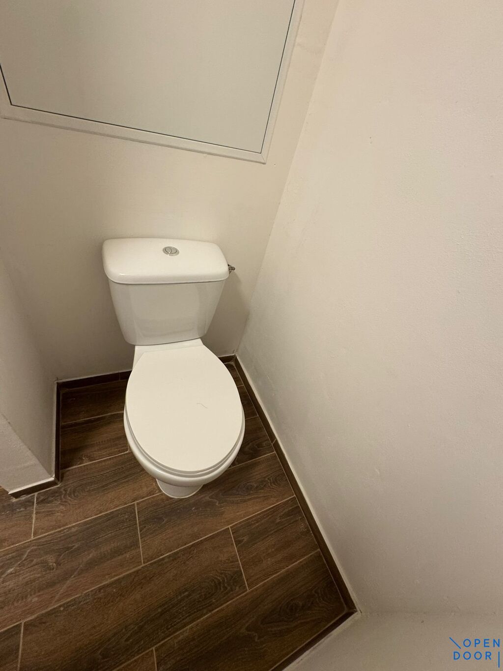 V koupelně je usazená vana se sprchou a je společná s toaletou, oddělená příčkou pro dostatek soukromí.
