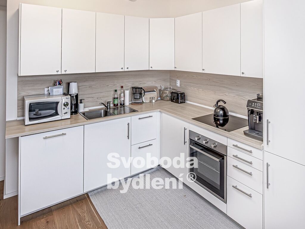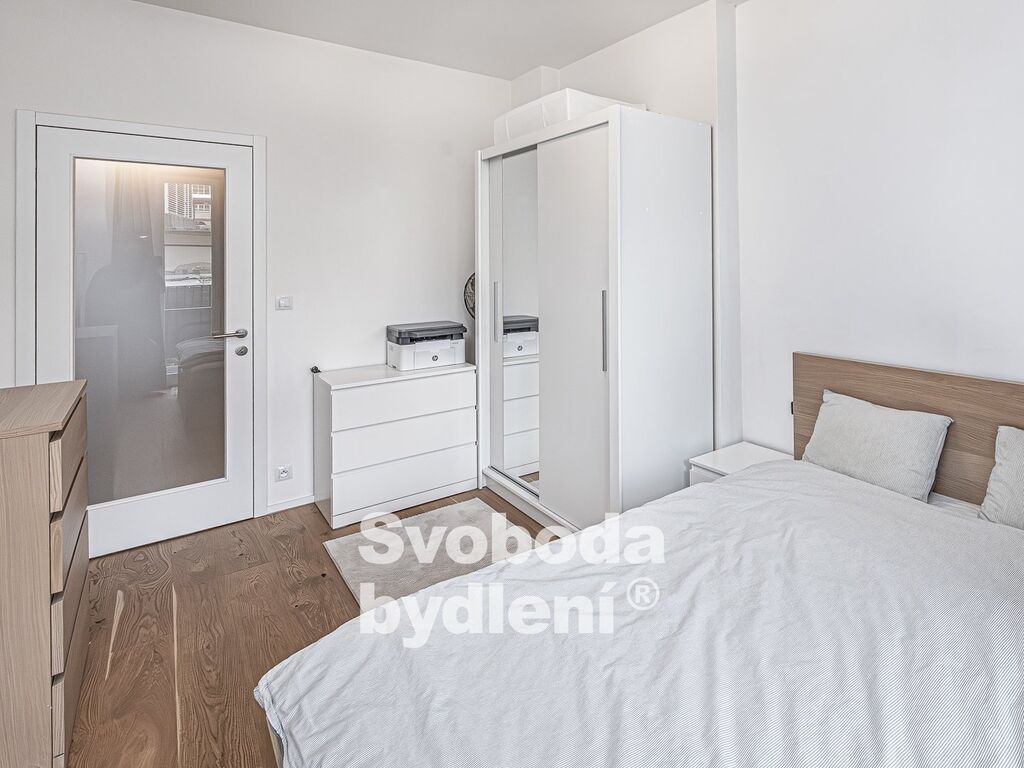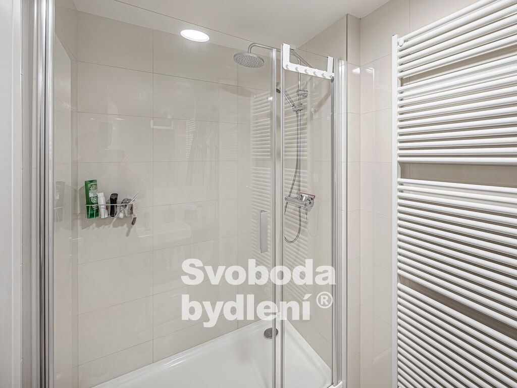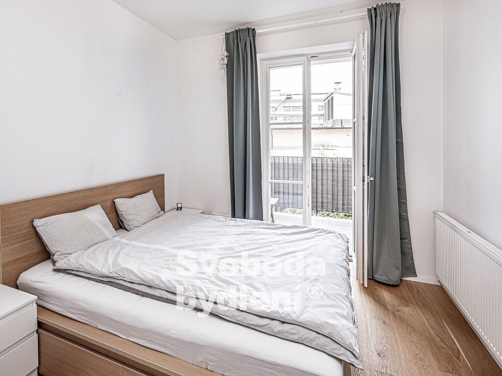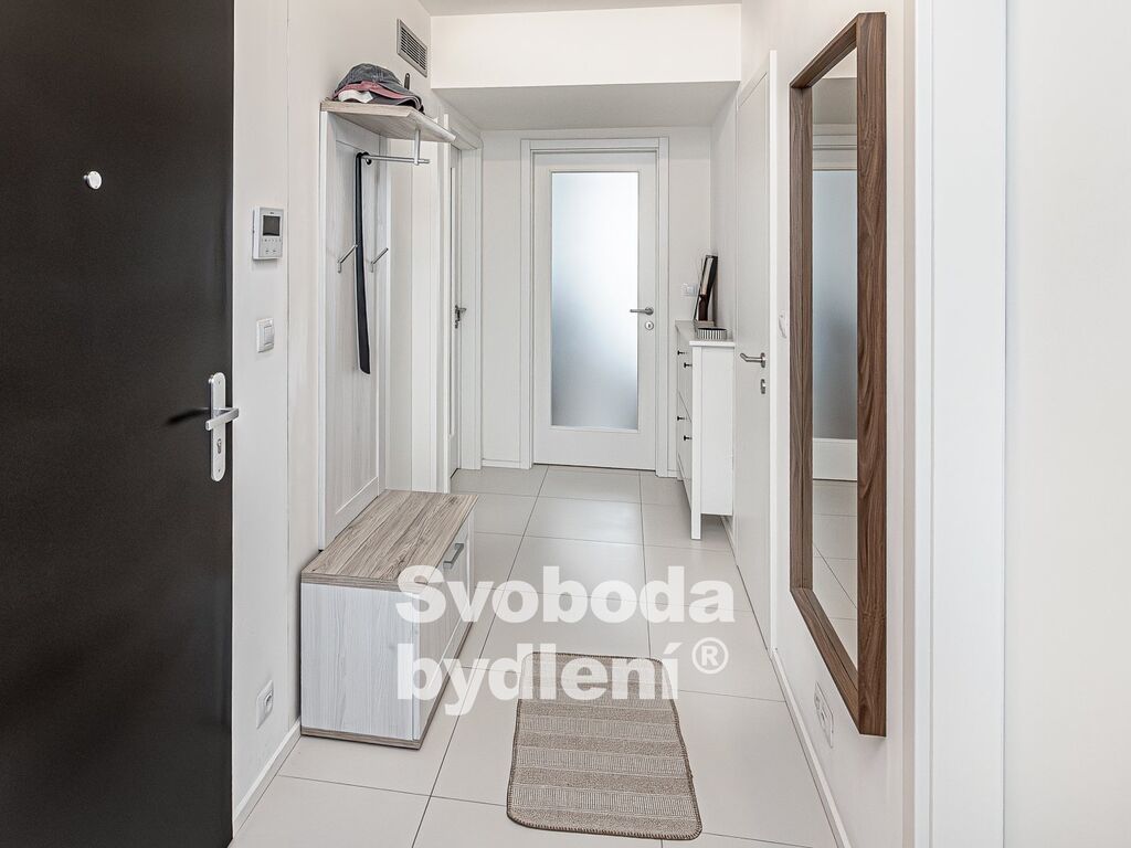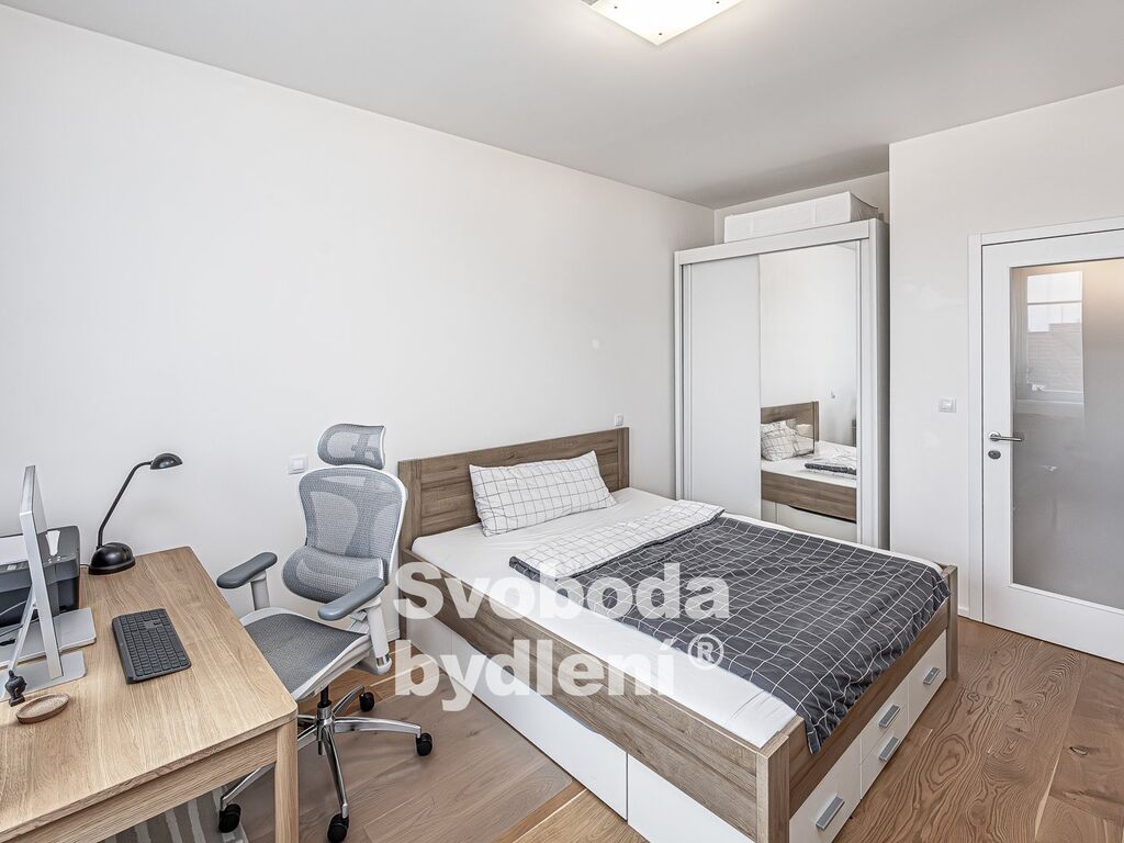 Obývací pokoj a vedlejší ložnice díky jižní orientaci a vyššímu patru nabízí příjemné prosvětlení a výhled přes střechy domů do okolí. Ložnice s balkonem jsou orientovány na sever do vnitrobloku. Kuchyňská linka je vybavena všemi spotřebiči (elektrickou varnou deskou, troubou, lednicí a myčkou). V koupelně nalezneme velký sprchový kout, umyvadlo a topný žebřík. Komora v bytě disponuje přípojkou na pračku a sušičku. Základní vybavení v bytě zůstává.