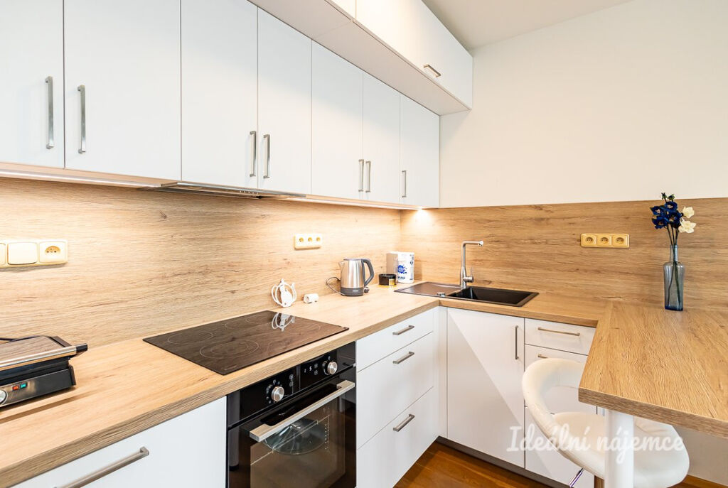 Byt se nabízí plně vybavený. Kuchyně disponuje lednicí s mrazákem, myčkou, elektrickou troubou, varnou deskou a digestoří. Obývací část je zařízena pohovkou, konferenčním stolem, barovým stolem s 2 židlemi, televizí a vyklápěcí postelí. V koupelně je sprchový kout, zrcadlo, umyvadlo a toaleta. V předsíni je vestavěná skříň, požární hlásič a intercom.