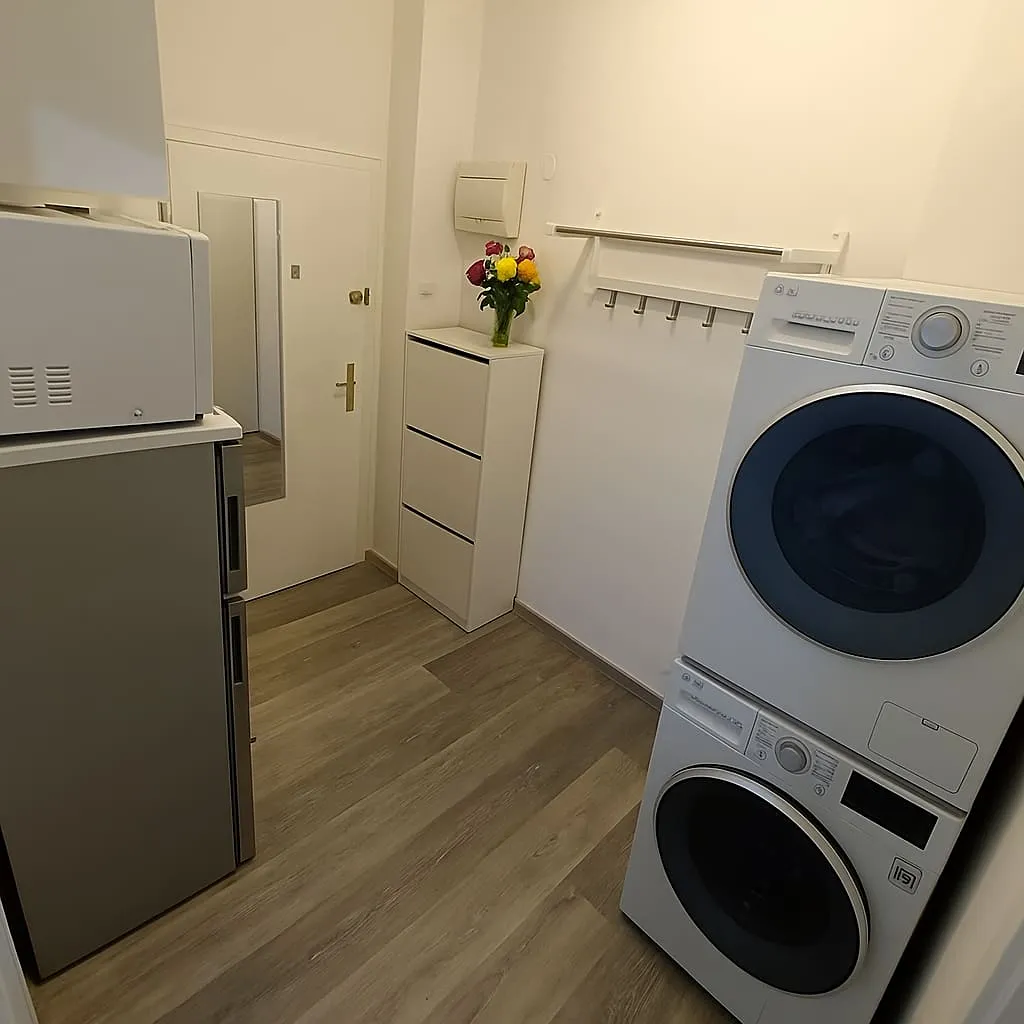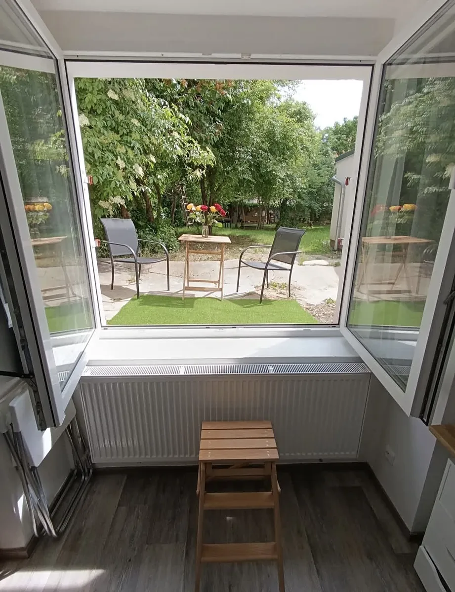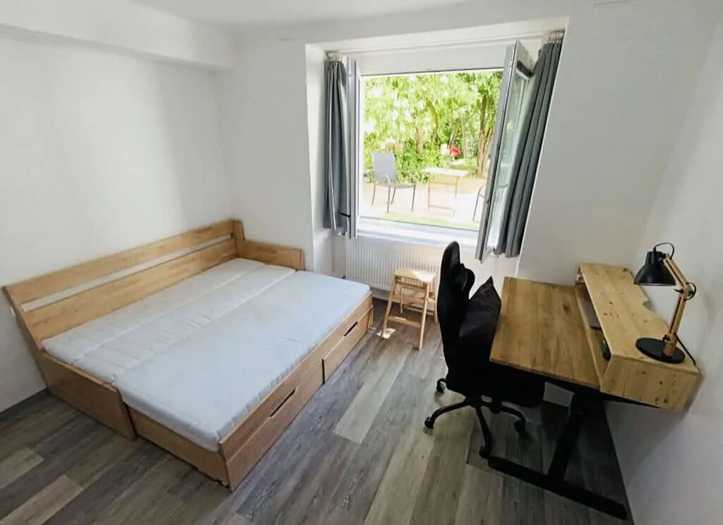 Obývací pokoj s kuchyňským koutem a vstupem na zahradu, plně vybavená kuchyňská linka (myčka, indukční sporák, trouba, pračka, sušička, digestoř, lednice s mrazákem, mikrovlnná trouba), kompletně zařízený interiér (rozkládací postel, matrace, jídelní stůl, židle, šatní skříň se zrcadlem, pracovní stůl, polohovací kancelářská židle), koupelna se sprchovým koutem a WC a úložné prostory (sklep po dohodě, kočárkárna/kolárna v domě).
