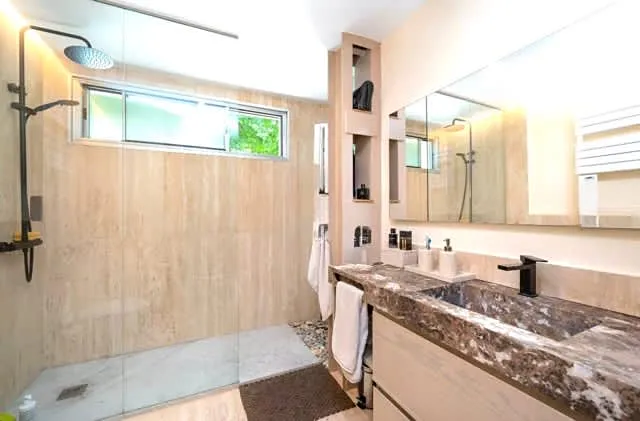 • 3 ložnice: dvě s vlastními koupelnami a jedna prostorná ložnice pro hosty.