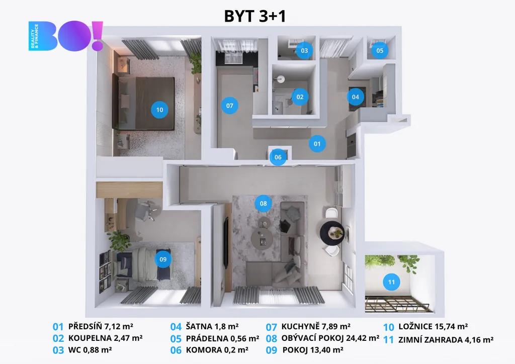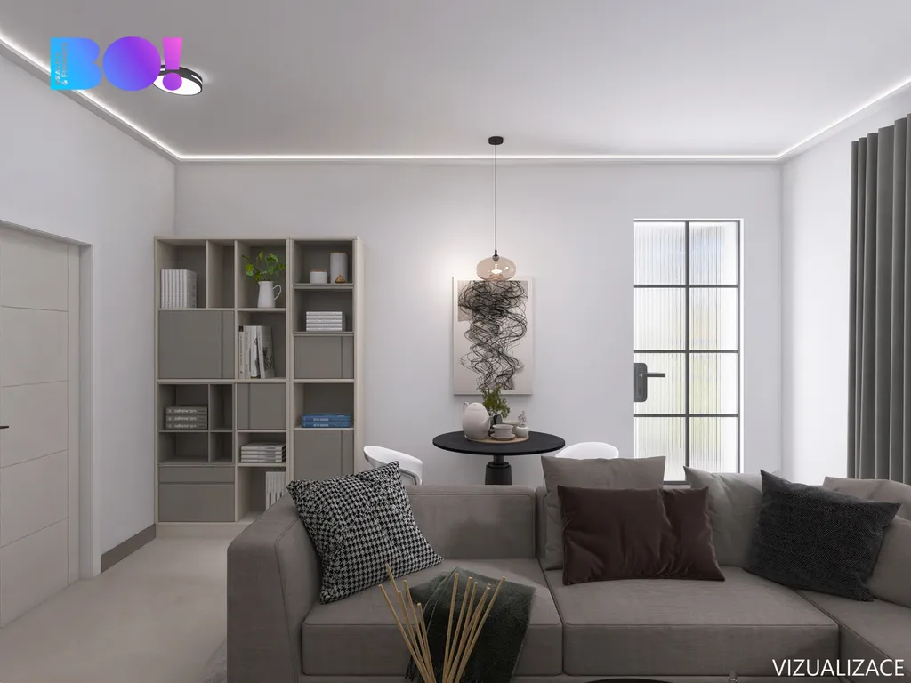 V předsíni je vestavěná skříň připravená na pračku a sušičku, hned u vstupu do kuchyně praktický kumbál na úklidové potřeby a nad vstupem úložný prostor třeba na sezónní věci. Kuchyň je plně vybavena – myčka, trouba, varná deska, lednice i dřez. V ložnici je k dispozici prostorná vestavěná skříň. Zbylý nábytek, který je viditelný na vizualizacích nebude součástí bytu.